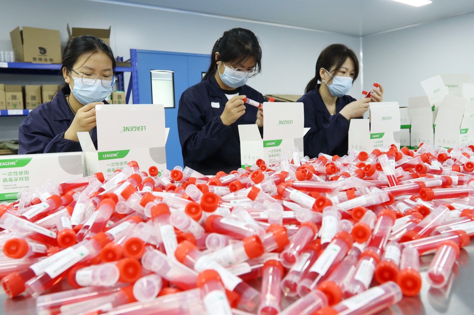 7月5日,在淮北市相山經(jīng)濟(jì)開(kāi)發(fā)區(qū)一家生物技術(shù)企業(yè)包裝車(chē)間,工人檢查采樣管。