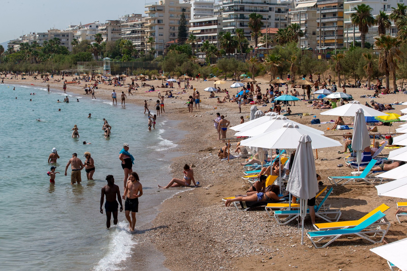 6月22日,在希臘雅典郊區(qū)海灘,人們在游泳消暑。