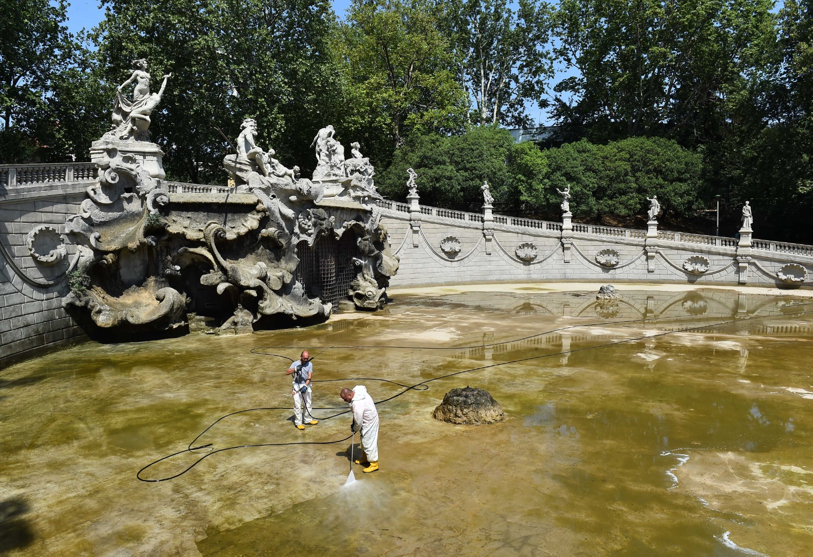 6月18日,工作人員在意大利都靈清理缺水的噴泉。