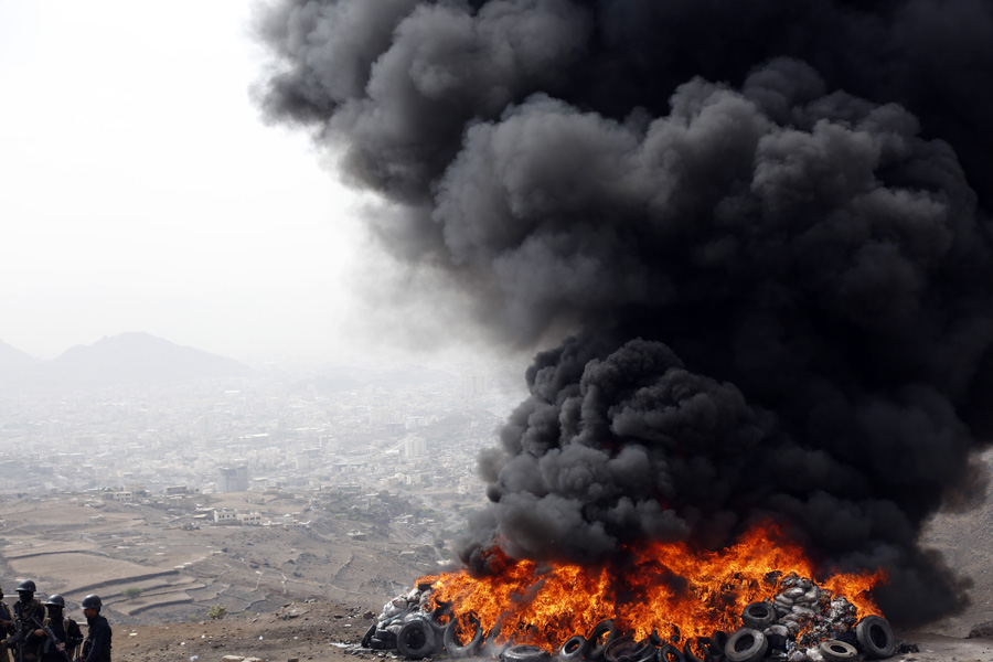 這是6月26日在也門薩那拍攝的毒品銷毀現(xiàn)場。