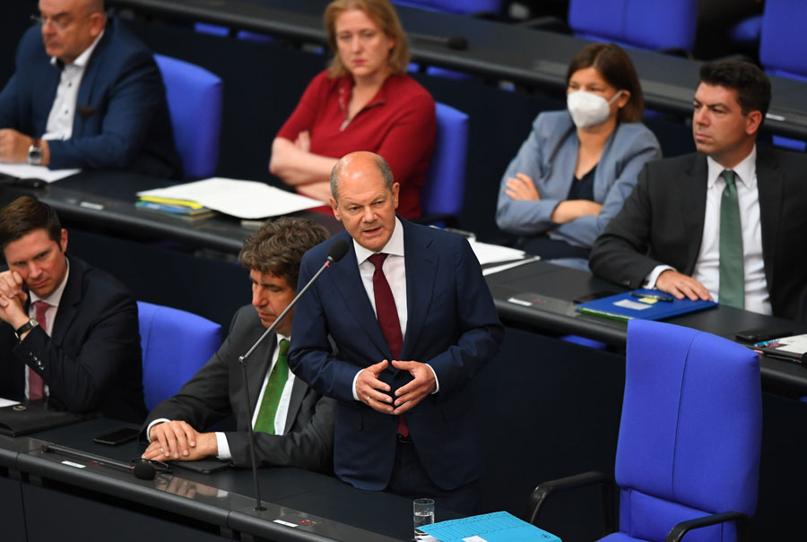 7月6日,德國總理朔爾茨(前右)在位于柏林的德國聯(lián)邦議會接受例行問詢。