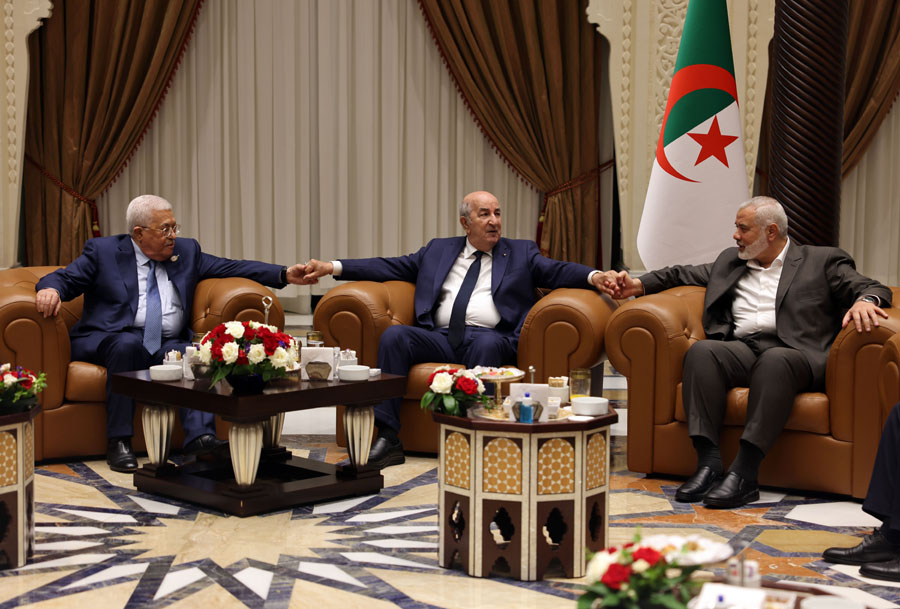 7月5日,在阿爾及利亞阿爾及爾,巴勒斯坦總統(tǒng)、巴民族解放運動(法塔赫)主席阿巴斯(左)與巴伊斯蘭抵抗運動(哈馬斯)政治局領導人伊斯梅爾·哈尼亞(右)出席由阿爾及利亞總統(tǒng)特本(中)促成的會晤。