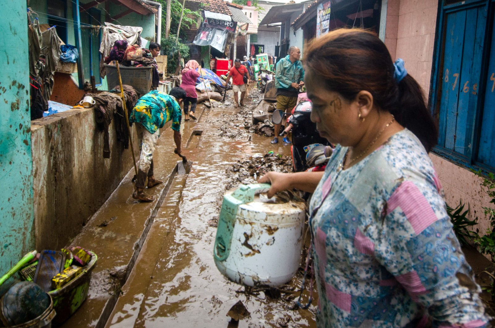 7月16日,在印尼西爪哇省加魯特,當(dāng)?shù)鼐用袂謇肀缓樗忠u的房屋。