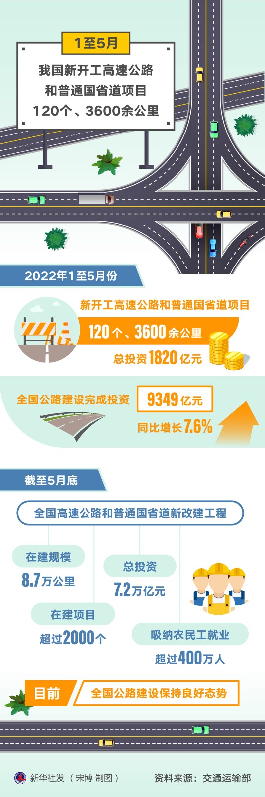 “今年1至5月份,新開工高速公路和普通國省道項(xiàng)目120個(gè)、3600余公里,總投資1820億元。”交通運(yùn)輸部副部長趙沖久說。