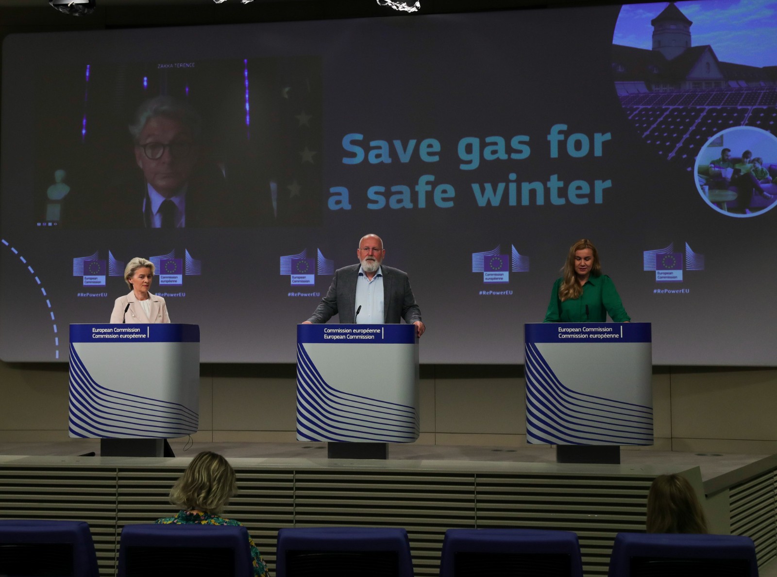 7月20日,在比利時(shí)布魯塞爾,歐盟委員會主席馮德萊恩(左一)、歐盟委員會執(zhí)行副主席蒂默曼斯(右二)、負(fù)責(zé)內(nèi)部市場的歐盟委員蒂埃里·布雷東(視頻參會)、負(fù)責(zé)能源事務(wù)的歐盟委員卡德麗·西姆松(右一)出席新聞發(fā)布會。