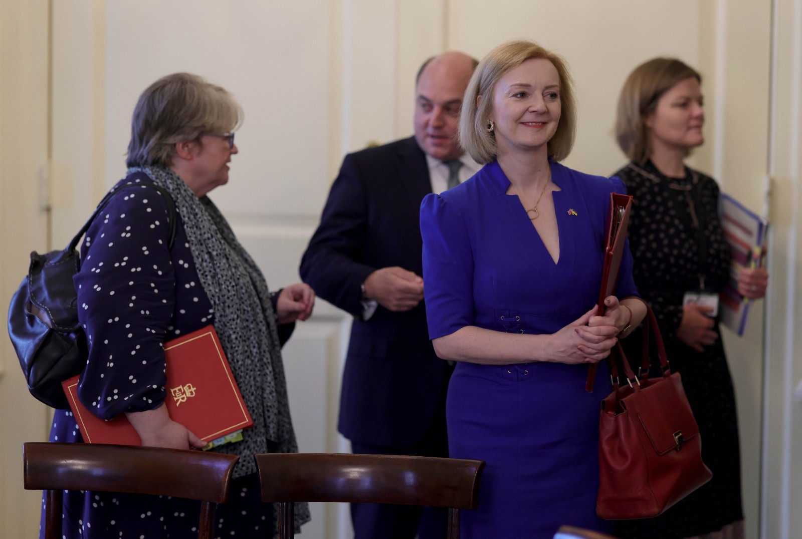 這是伊麗莎白·特拉斯(右二)在英國(guó)倫敦首相府參加內(nèi)閣會(huì)議后離開(kāi)的資料照片(7月12日攝)。