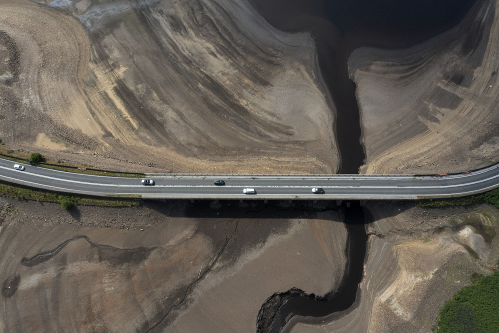 這是7月19日在英國曼徹斯特附近拍攝的幾近干涸的伍德黑德水庫(無人機拍攝)。