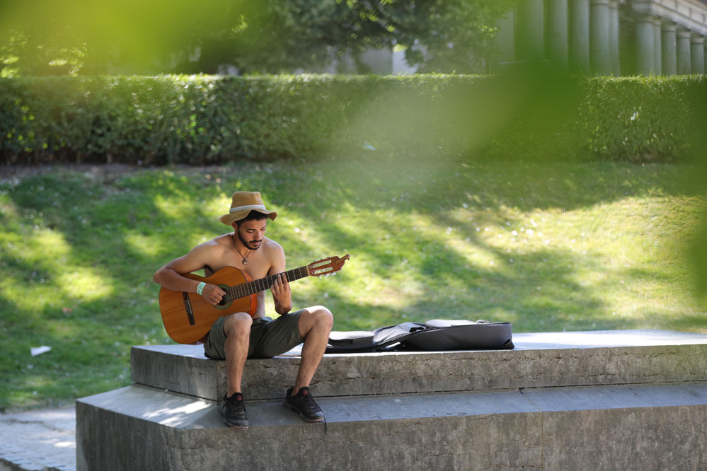 7月19日,一名男子在比利時布魯塞爾五十周年紀念公園的樹蔭下彈吉他。