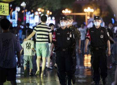 圖為7月18日晚,民警聯合武警在步行街進行巡邏。