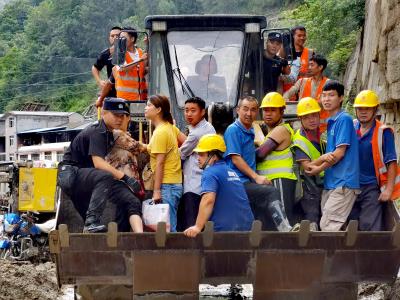 圖為綿陽市公安局特巡警支隊特警大隊民警和其他救援人員一起乘坐推土機前往災情嚴重地點救援群眾。