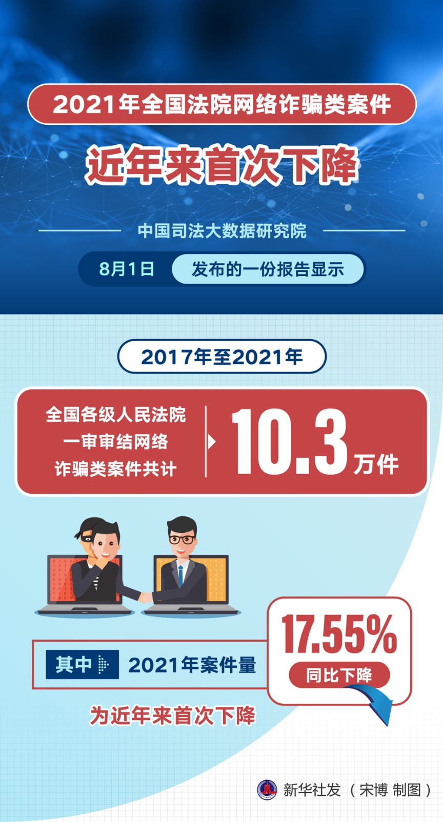 中國司法大數(shù)據(jù)研究院8月1日發(fā)布的一份報告顯示,2017年至2021年全國各級人民法院一審審結網(wǎng)絡詐騙類案件共計10.3萬件,其中2021年案件量同比下降17.55%,為近年來首次下降。