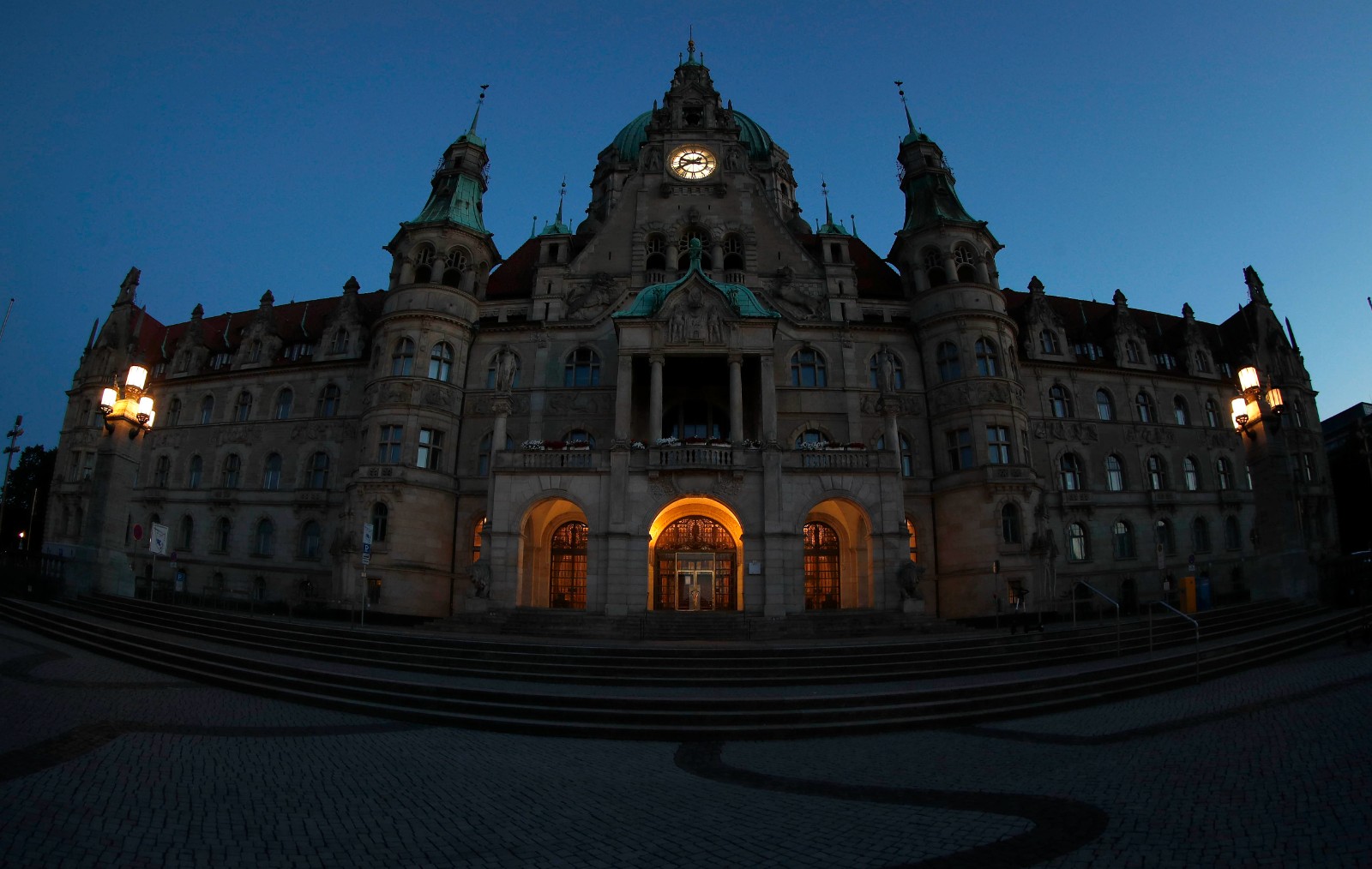 這是8月1日晚拍攝的德國漢諾威市政廳。