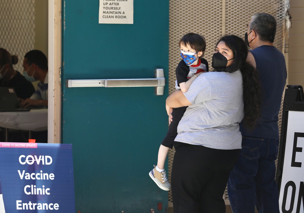 8月5日,在美國加利福尼亞州洛杉磯縣,戴著口罩的當(dāng)?shù)鼐用竦却臃N新冠疫苗。