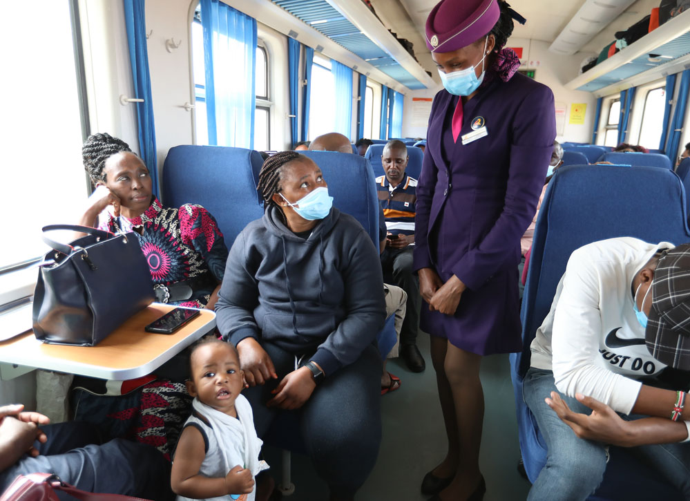 7月29日,列車員菲奧娜(站立者)在蒙內鐵路客運列車上與乘客交流。