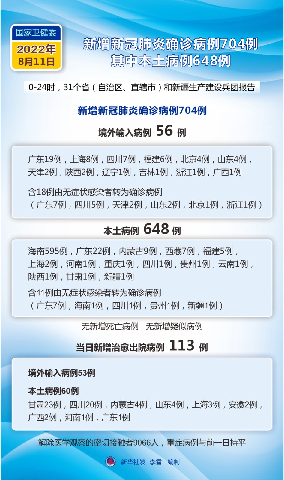 (圖表)國(guó)家衛(wèi)健委:8月11日新增新冠肺炎確診病例704例 其中本土病例648例
