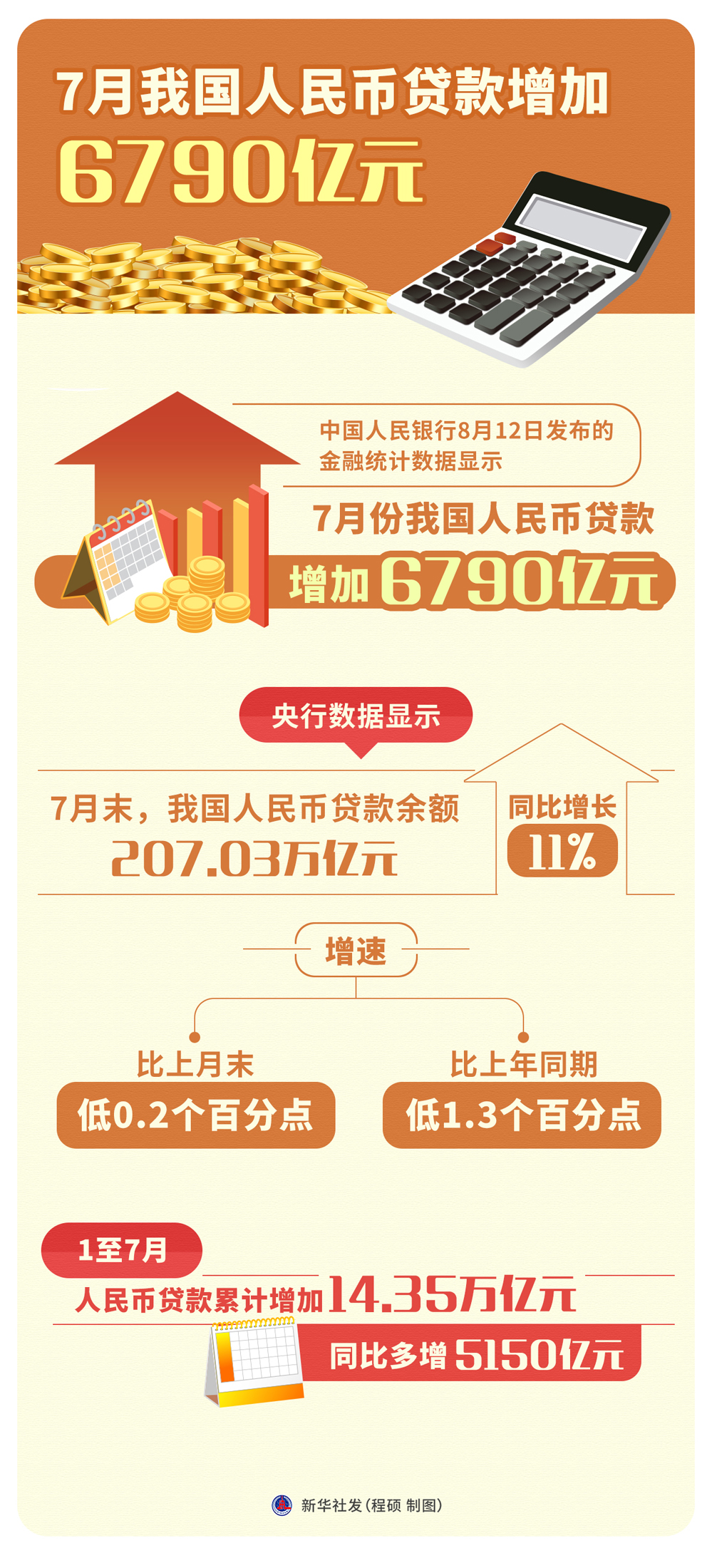 中國人民銀行8月12日發(fā)布的金融統(tǒng)計數(shù)據(jù)顯示,7月份我國人民幣貸款增加6790億元。