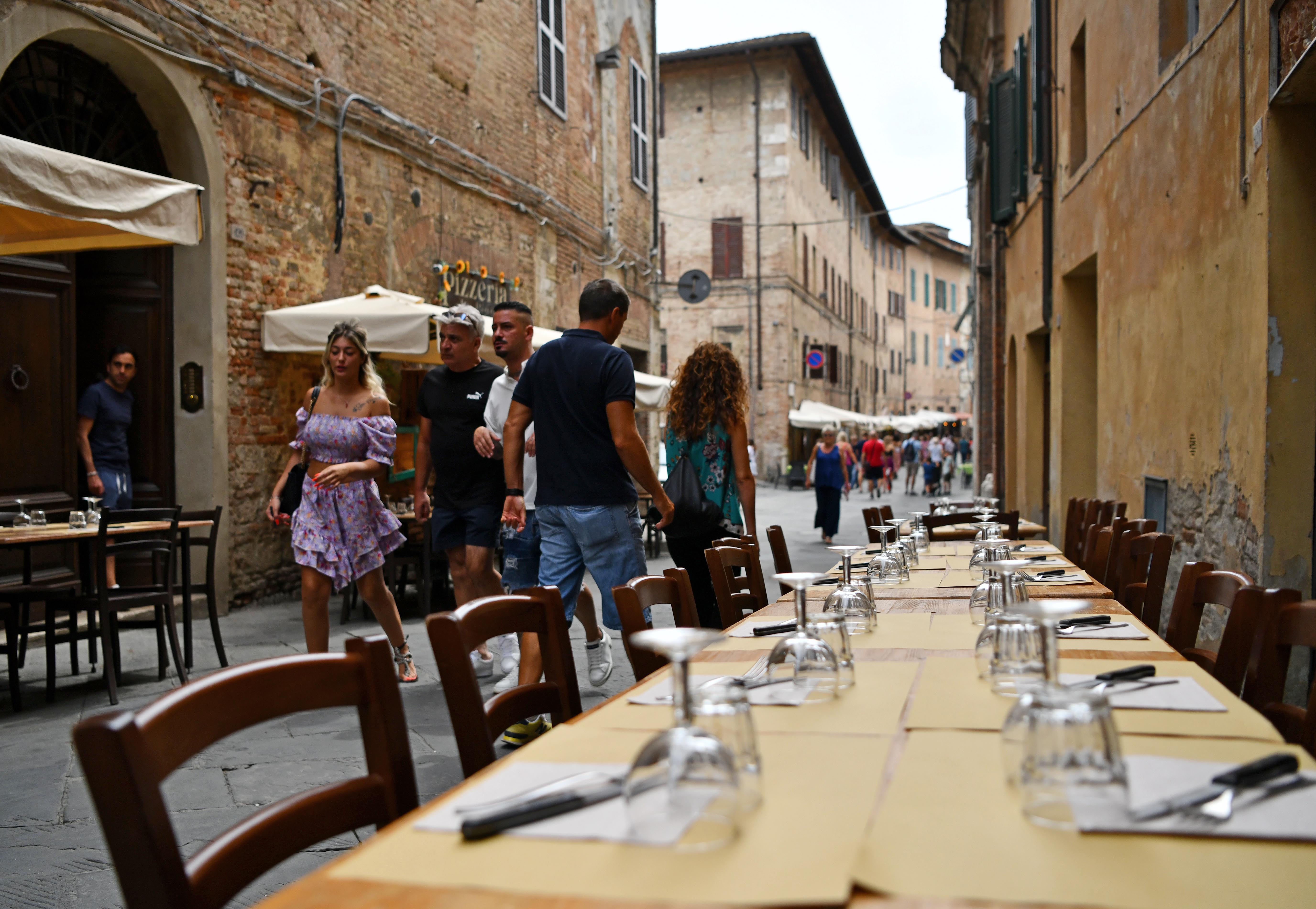 8月15日,游客們在意大利錫耶納街頭行走。