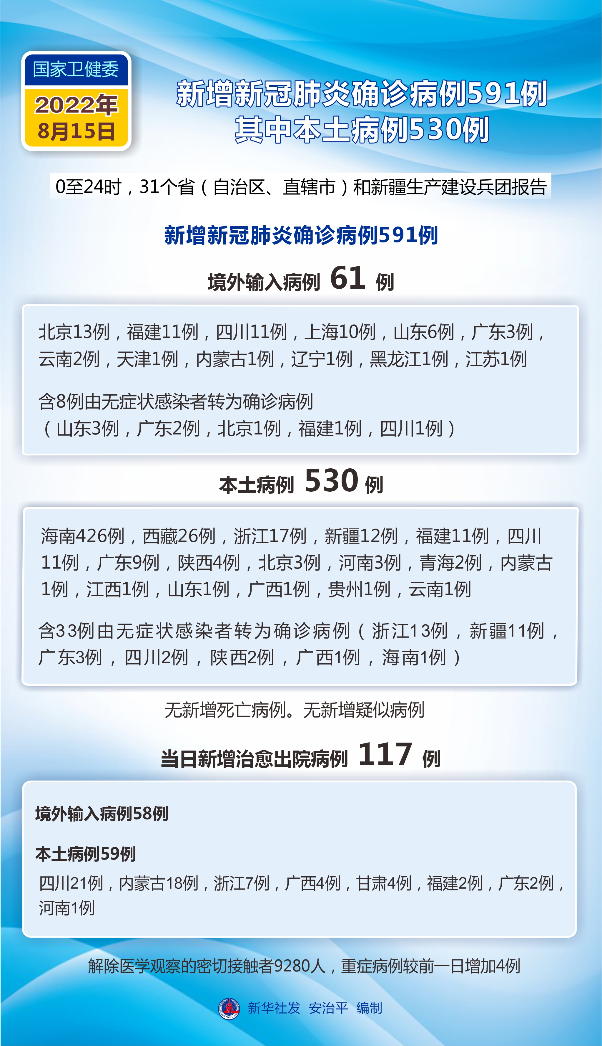 國家衛(wèi)生健康委員會8月16日通報,8月15日0至24時,31個?。ㄗ灾螀^(qū)、直轄市)和新疆生產(chǎn)建設(shè)兵團(tuán)報告新增新冠肺炎確診病例591例。