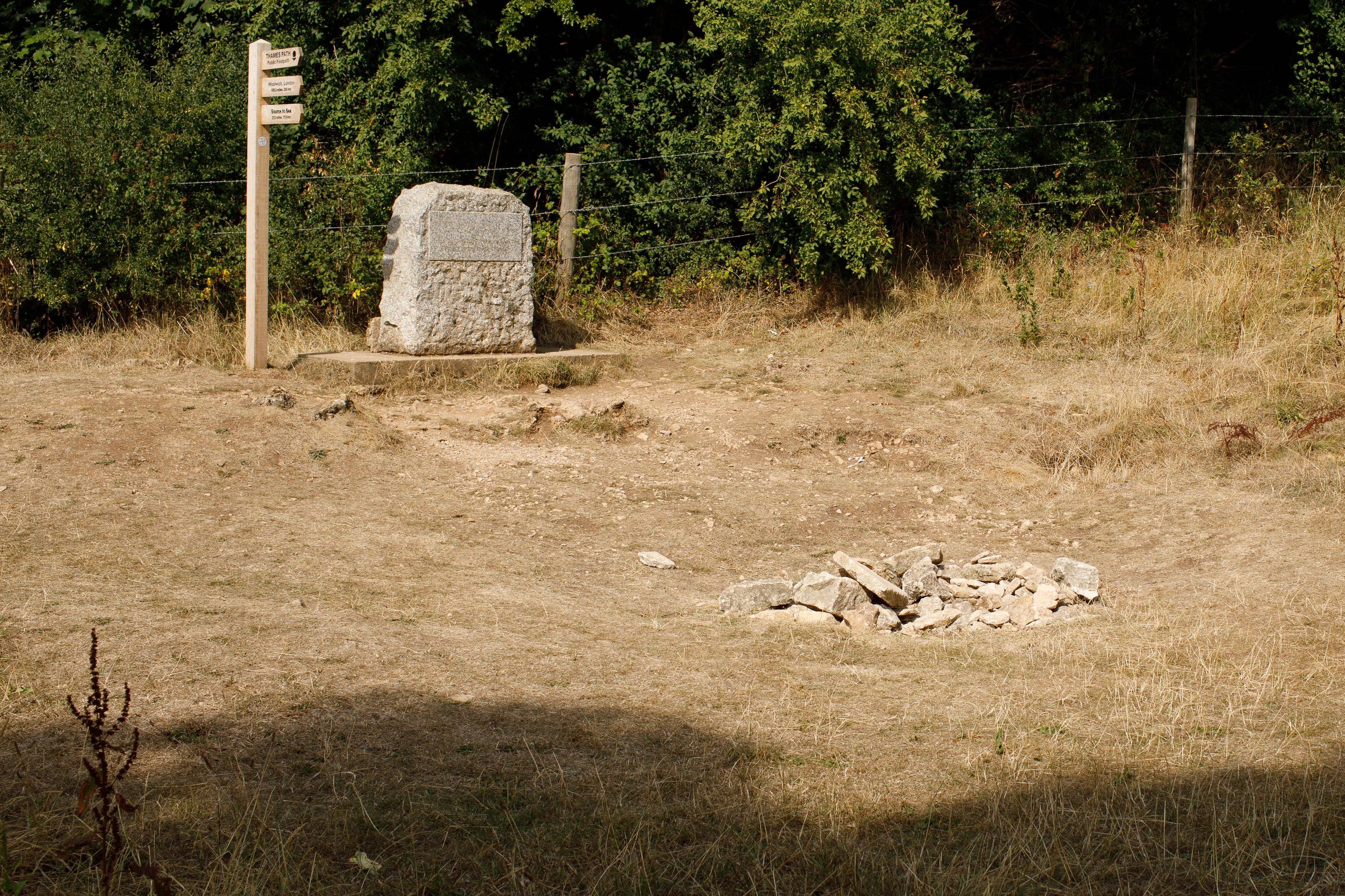 這是8月14日在英國賽倫塞斯特附近拍攝的干涸的泰晤士河發(fā)源地和一塊寫有“泰晤士河起點(diǎn)”的石碑。