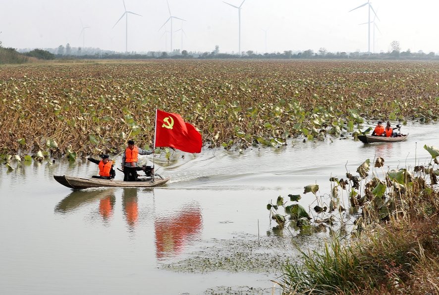 10月31日,在湖北省沙洋縣借糧湖水域,沙洋縣公安局毛李水陸派出所河湖警長(zhǎng)與村干部開展生態(tài)保護(hù)例行巡查。今年以來,沙洋縣公安局推進(jìn)河湖警長(zhǎng)工作機(jī)制,在漢江、長(zhǎng)湖等江河湖泊開展生態(tài)環(huán)境保護(hù)巡查,嚴(yán)厲打擊污染環(huán)境、非法捕撈、非法采砂等違法犯罪,為保護(hù)生態(tài)環(huán)境筑牢法治屏障。