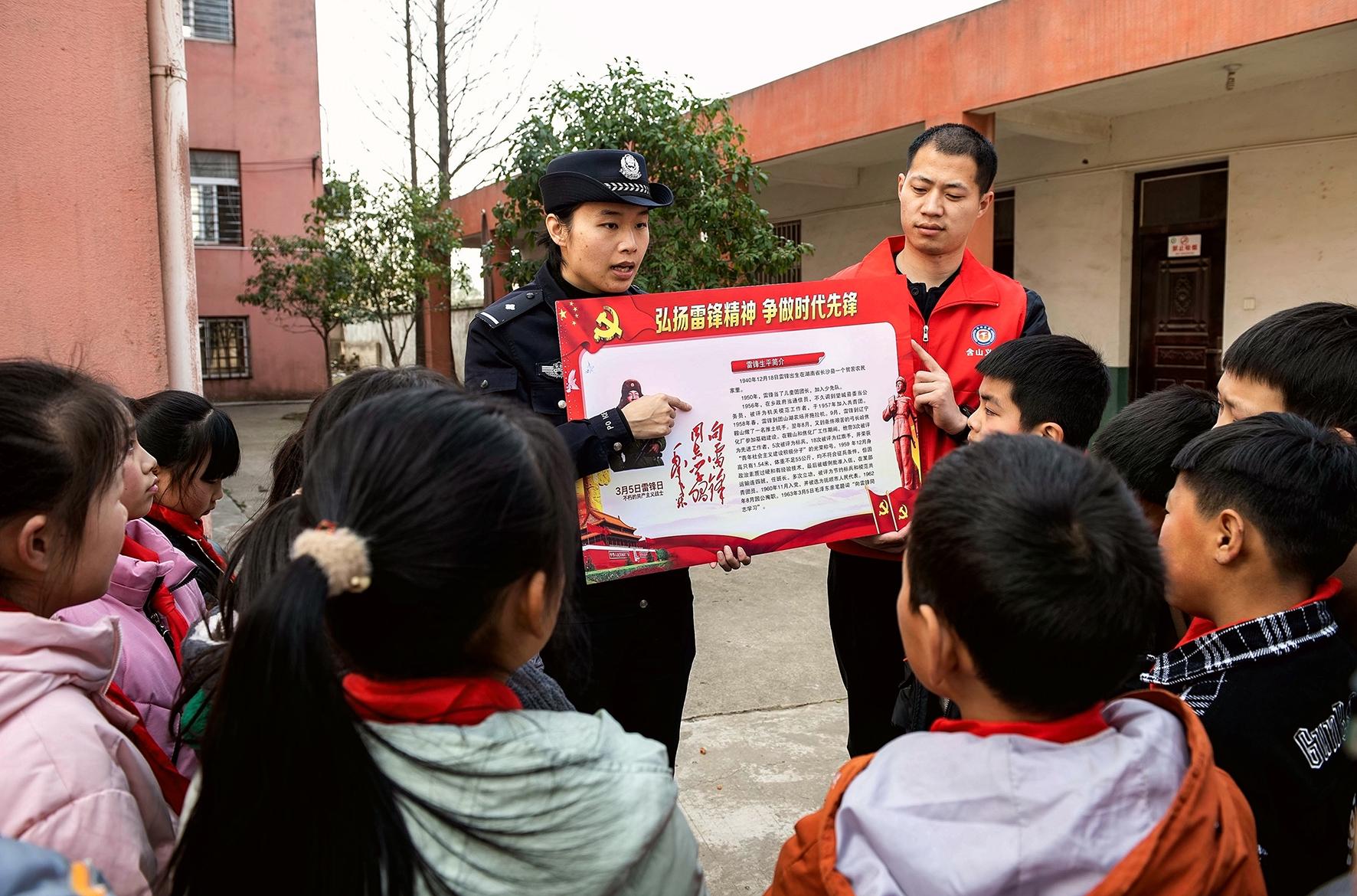 3月2日,安徽省含山縣公安局仙蹤派出所民警在姚廟中心學(xué)校,為學(xué)生講雷鋒故事。