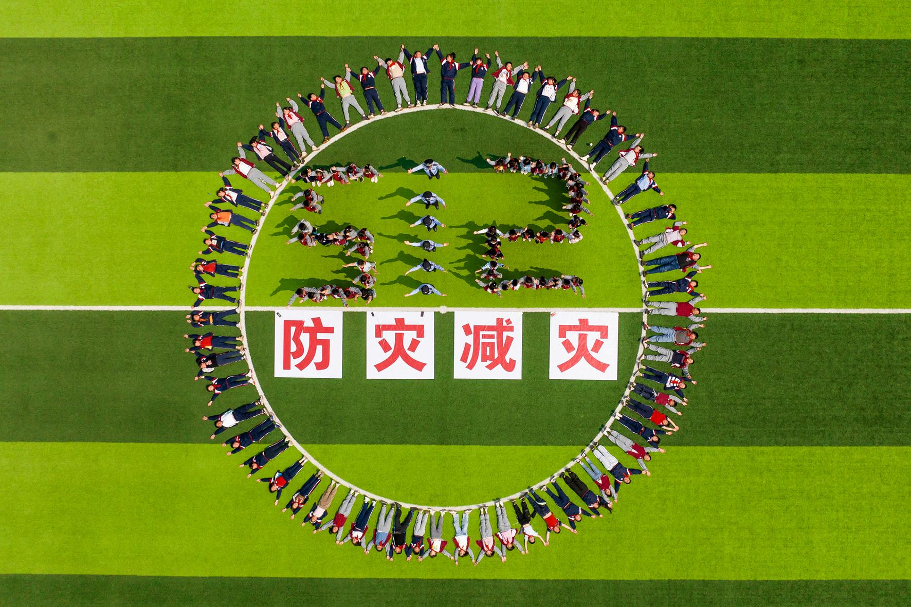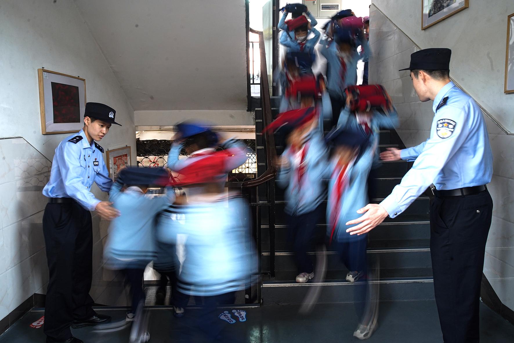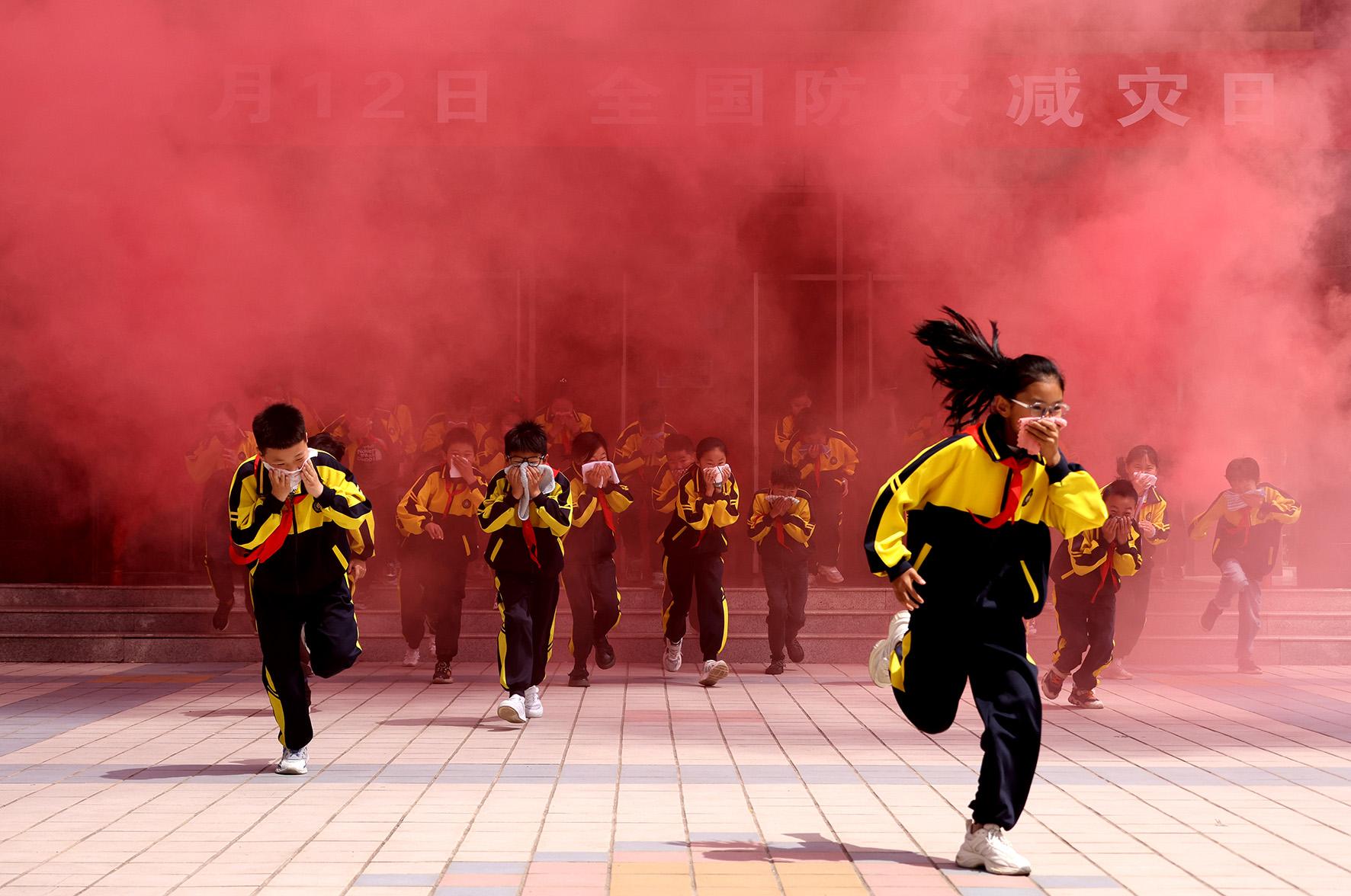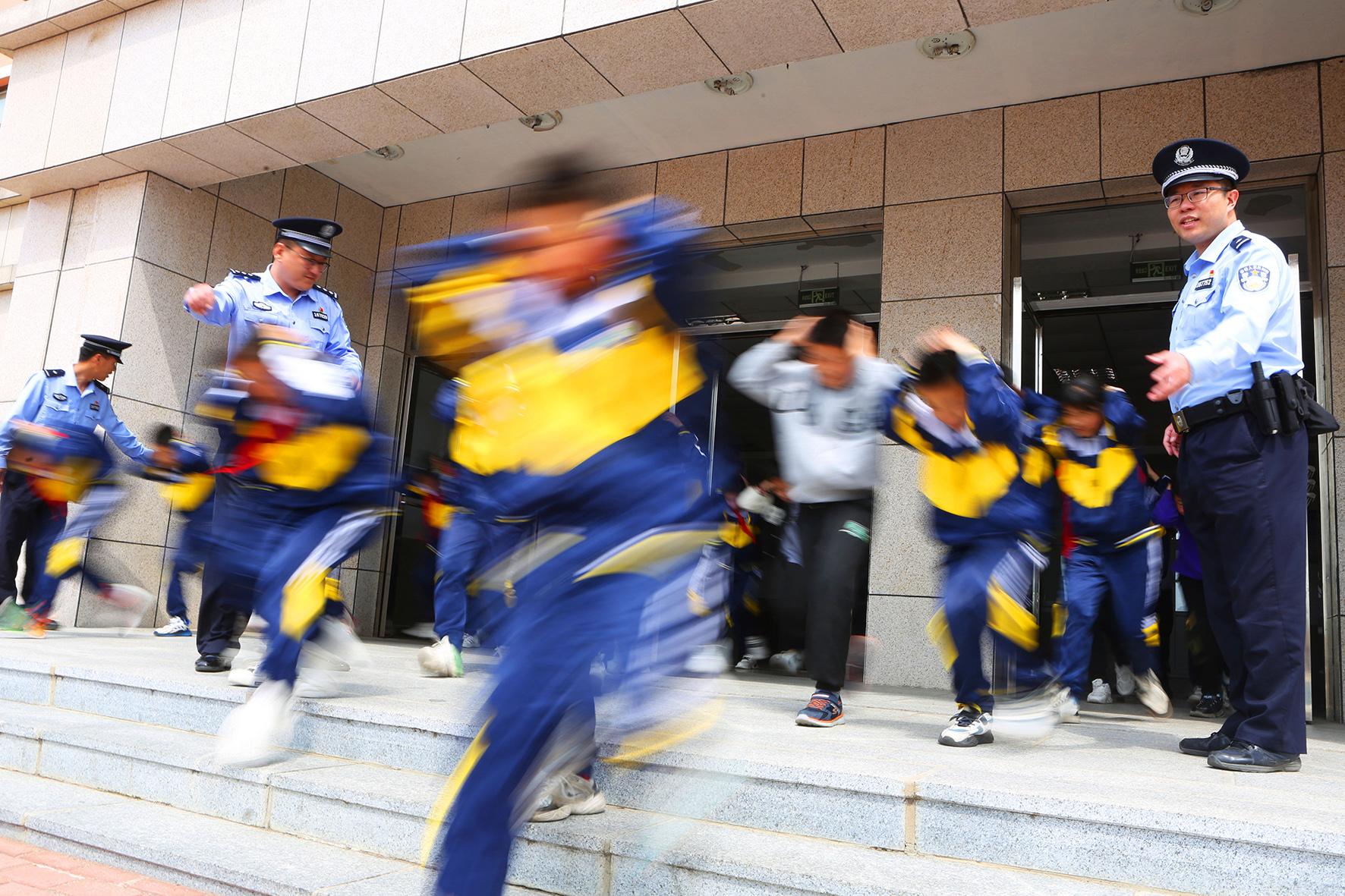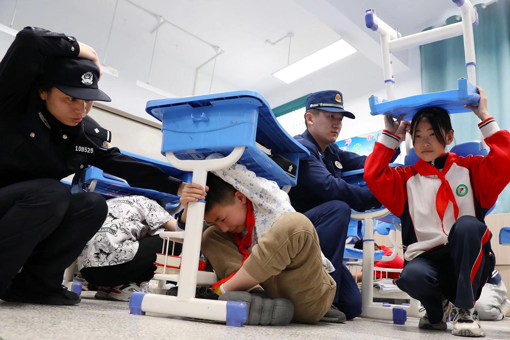 5月11日,在山東省棗莊市市中區(qū)開展的防災(zāi)減災(zāi)應(yīng)急演練活動(dòng)中,東湖小學(xué)學(xué)生在進(jìn)行地震防災(zāi)應(yīng)急避險(xiǎn)演練。