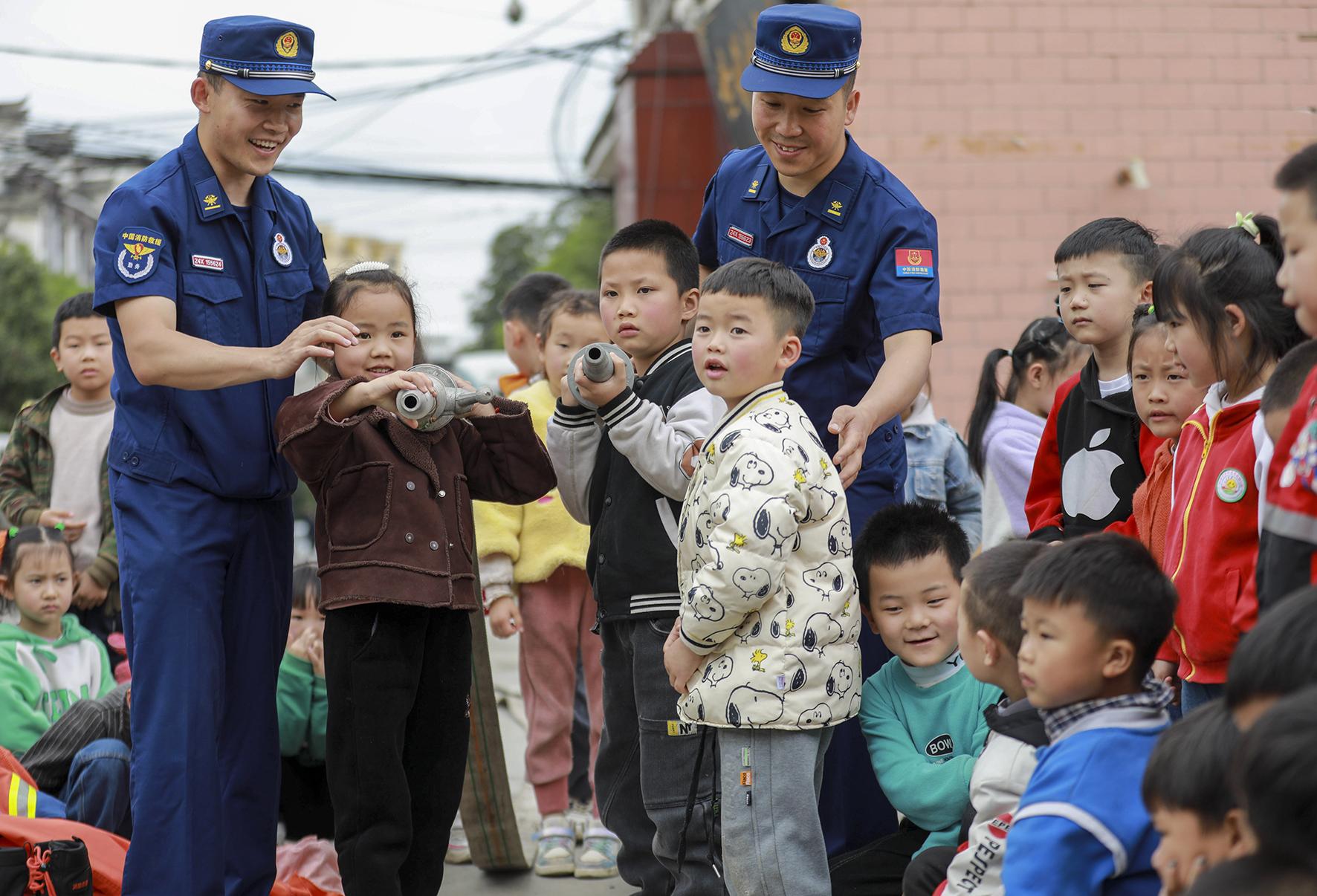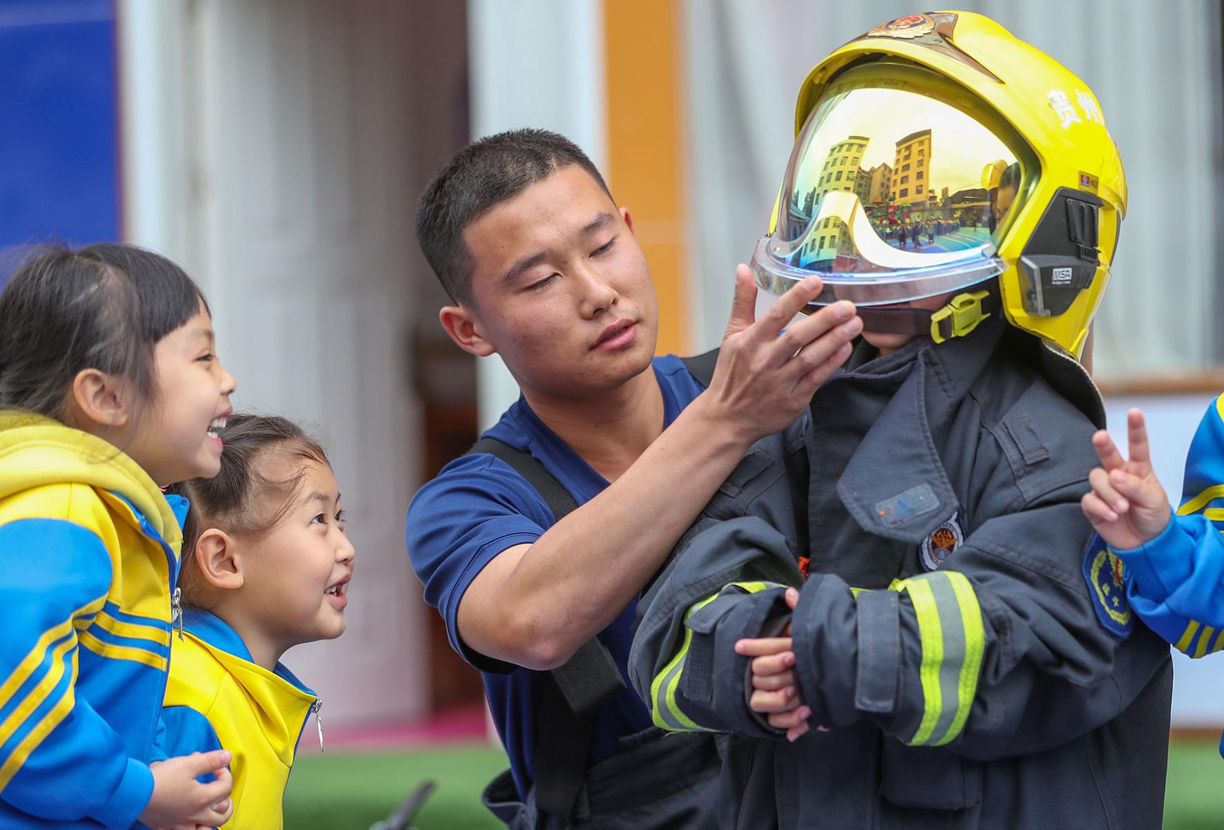 5月12日,貴州省銅仁市玉屏侗族自治縣童樂幼兒園舉行防災(zāi)減災(zāi)知識(shí)普及活動(dòng),消防員指導(dǎo)小朋友們體驗(yàn)消防服。
