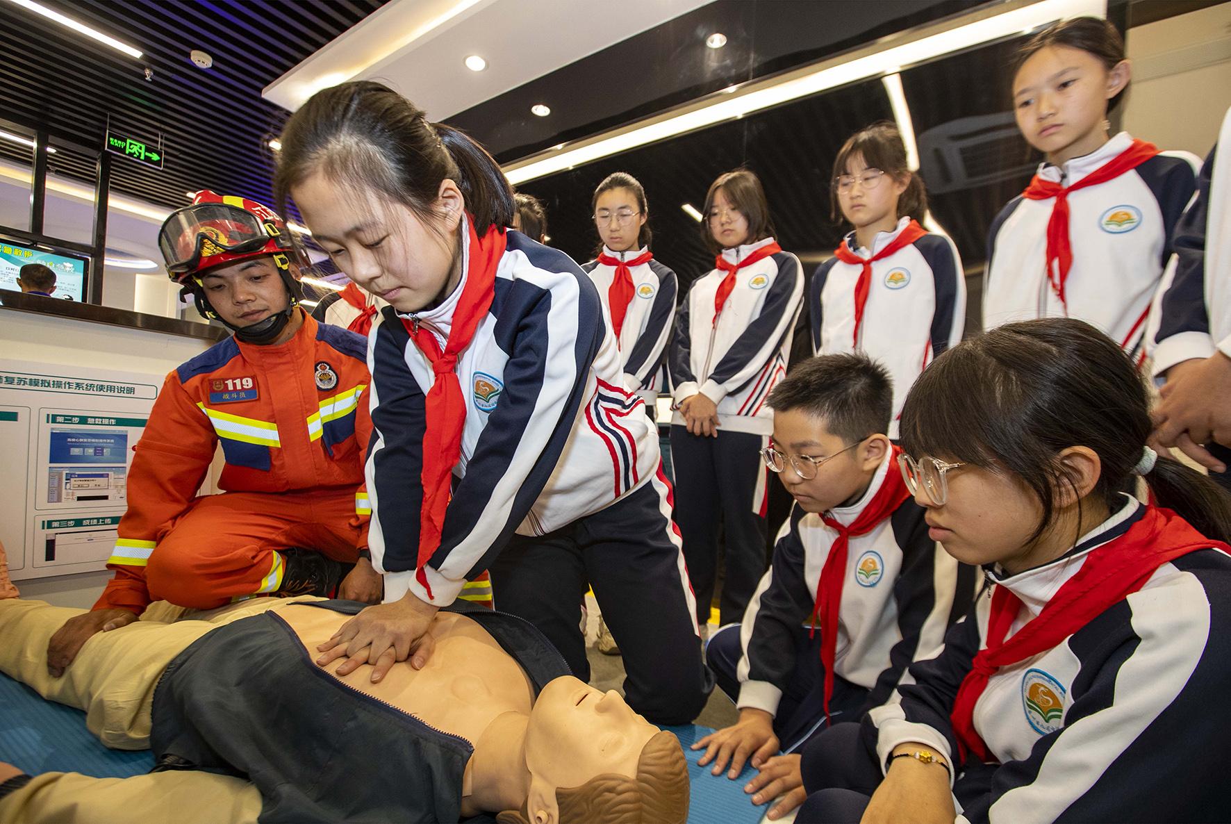 5月11日,在江蘇省泰州市消防科普教育基地,消防救援人員給九龍實(shí)驗(yàn)學(xué)校學(xué)生講解心肺復(fù)蘇知識(shí)。