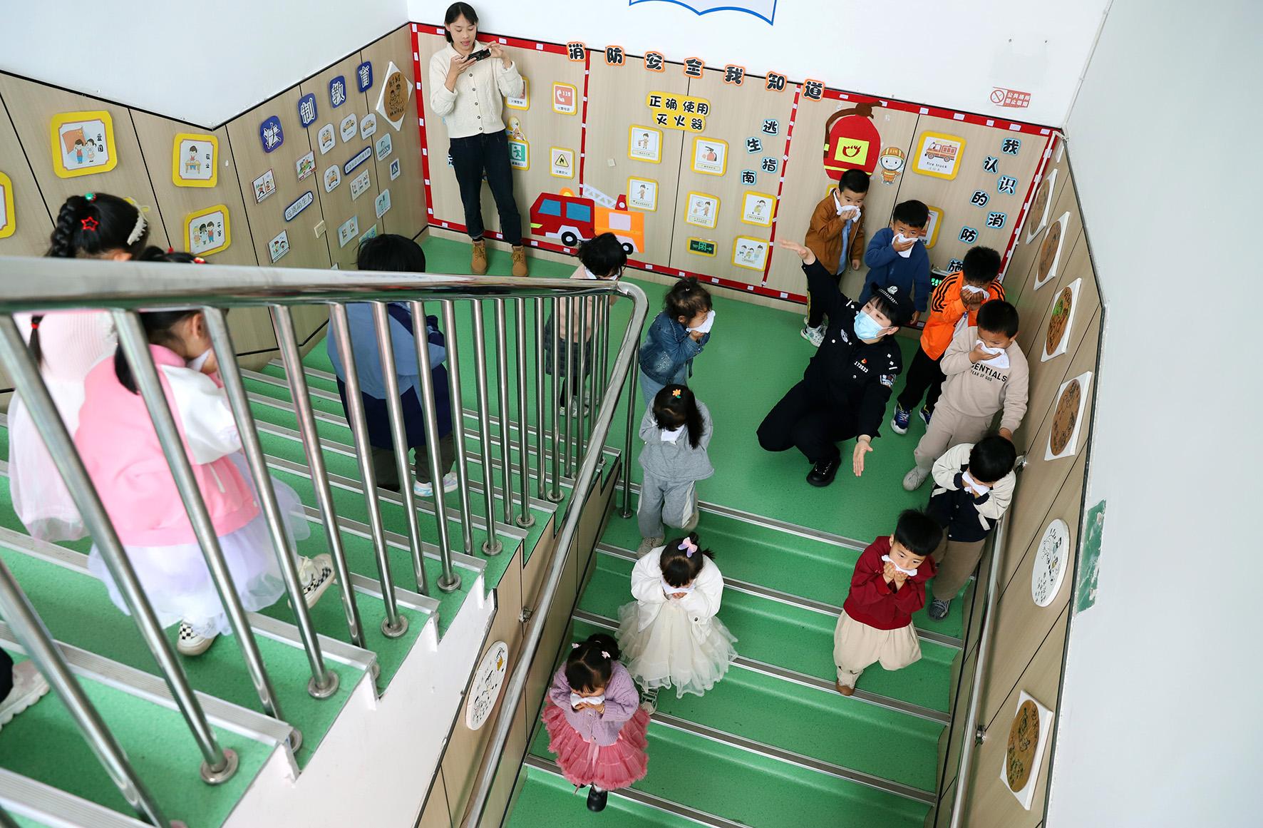 5月11日,浙江省臺(tái)州市路橋區(qū)橫街派出所民警在轄區(qū)育英幼兒園組織小朋友開展消防逃生演練。