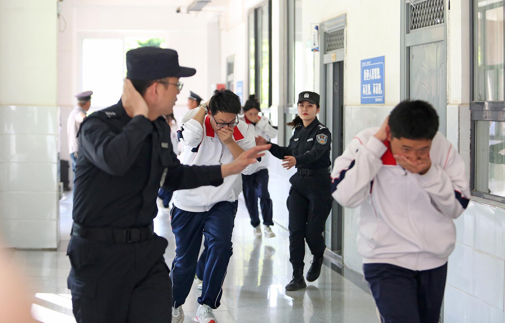 5月12日,陜西省渭南市公安局臨渭分局巡特警大隊(duì)開展全國防災(zāi)減災(zāi)日主題宣傳進(jìn)校園活動(dòng),特警隊(duì)員組織學(xué)生有序“逃生”。
