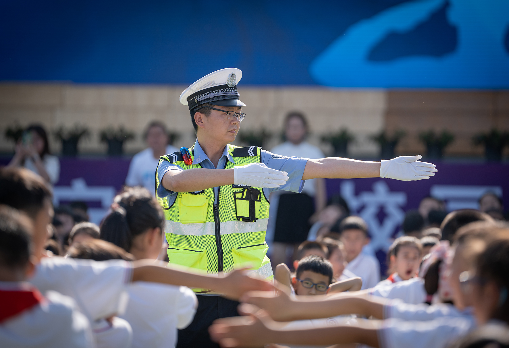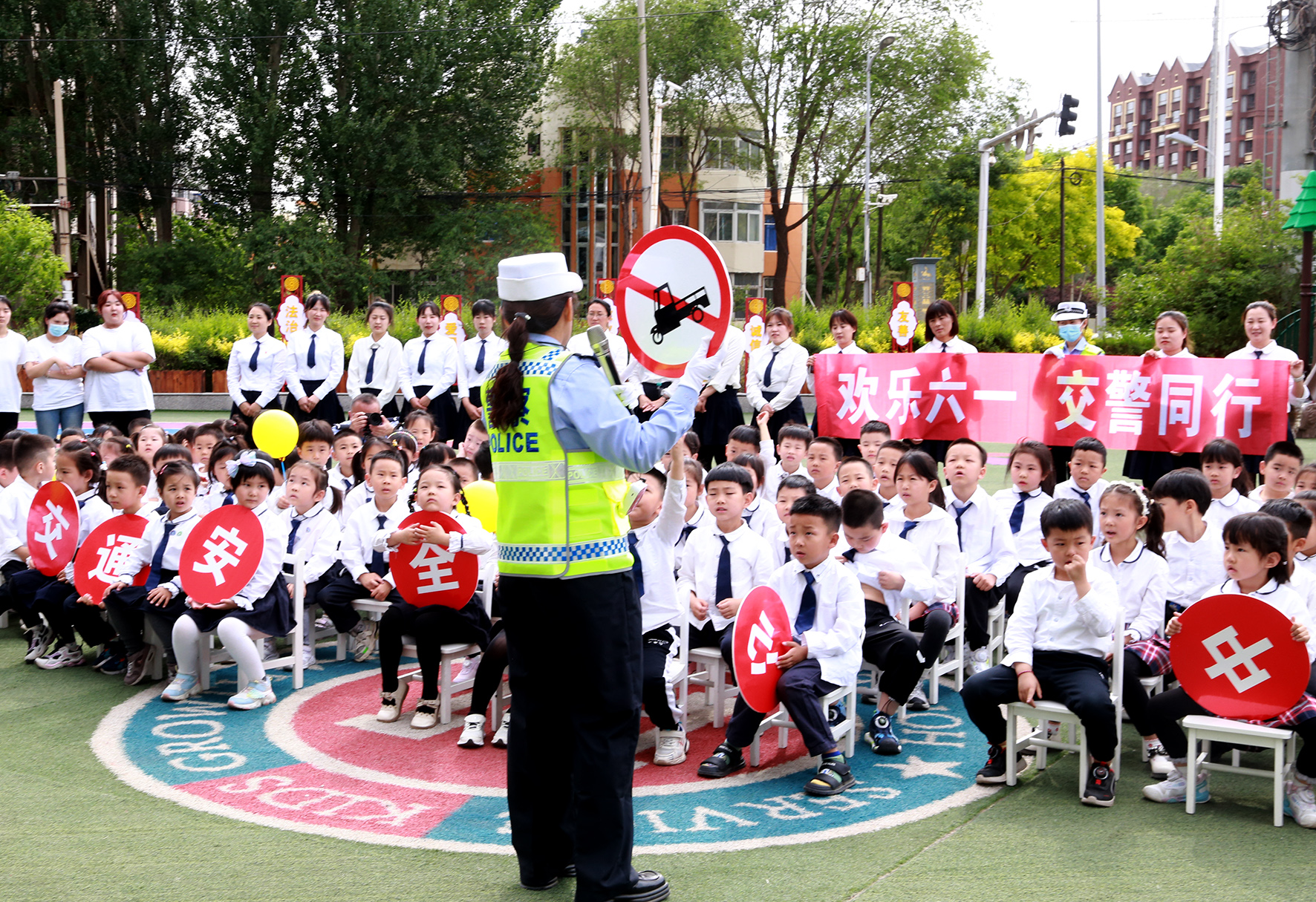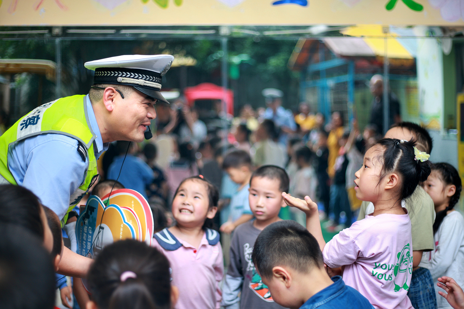 5月31日,山東省棗莊市公安局嶧城分局交警大隊(duì)民輔警走進(jìn)轄區(qū)韓林小學(xué)幼兒園,以交通情景游戲等形式,讓小朋友學(xué)習(xí)交通法規(guī)。