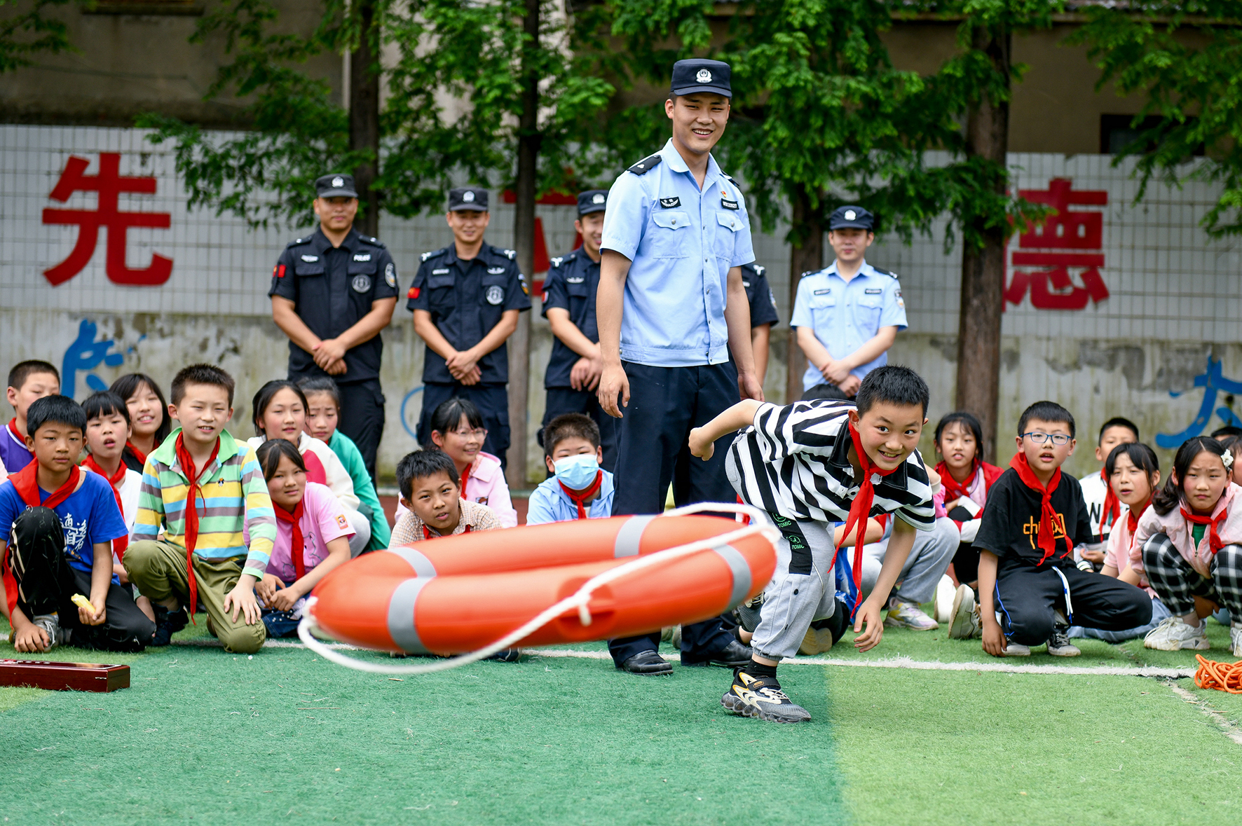 5月31日,安徽省馬鞍山市和縣公安局石楊派出所民警走進(jìn)石楊鎮(zhèn)中心小學(xué),通過(guò)緝毒犬表演、防溺水體驗(yàn)、傳授警體拳、安全知識(shí)有獎(jiǎng)競(jìng)答等活動(dòng),讓孩子們?cè)谠⒔逃跇?lè)中學(xué)習(xí)安全知識(shí)。