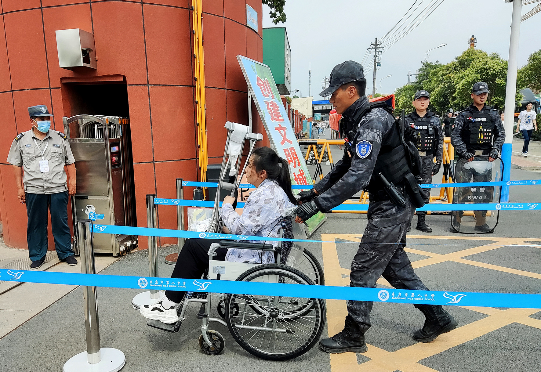 6月8日,甘肅省古浪縣公安局“愛心護考”執(zhí)勤點民輔警護送行動不便的考生進入考場。
