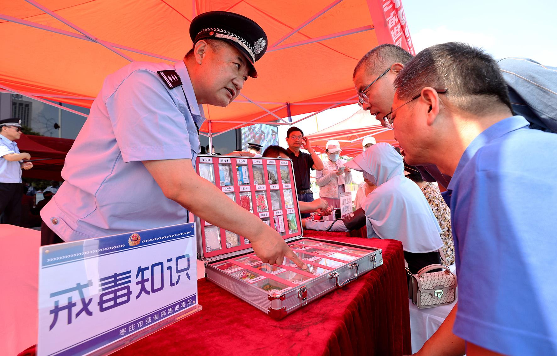 6月26日,山東省棗莊市公安、司法等部門在光明廣場(chǎng)開(kāi)展以“健康人生 綠色無(wú)毒”為主題的禁毒宣傳活動(dòng)。