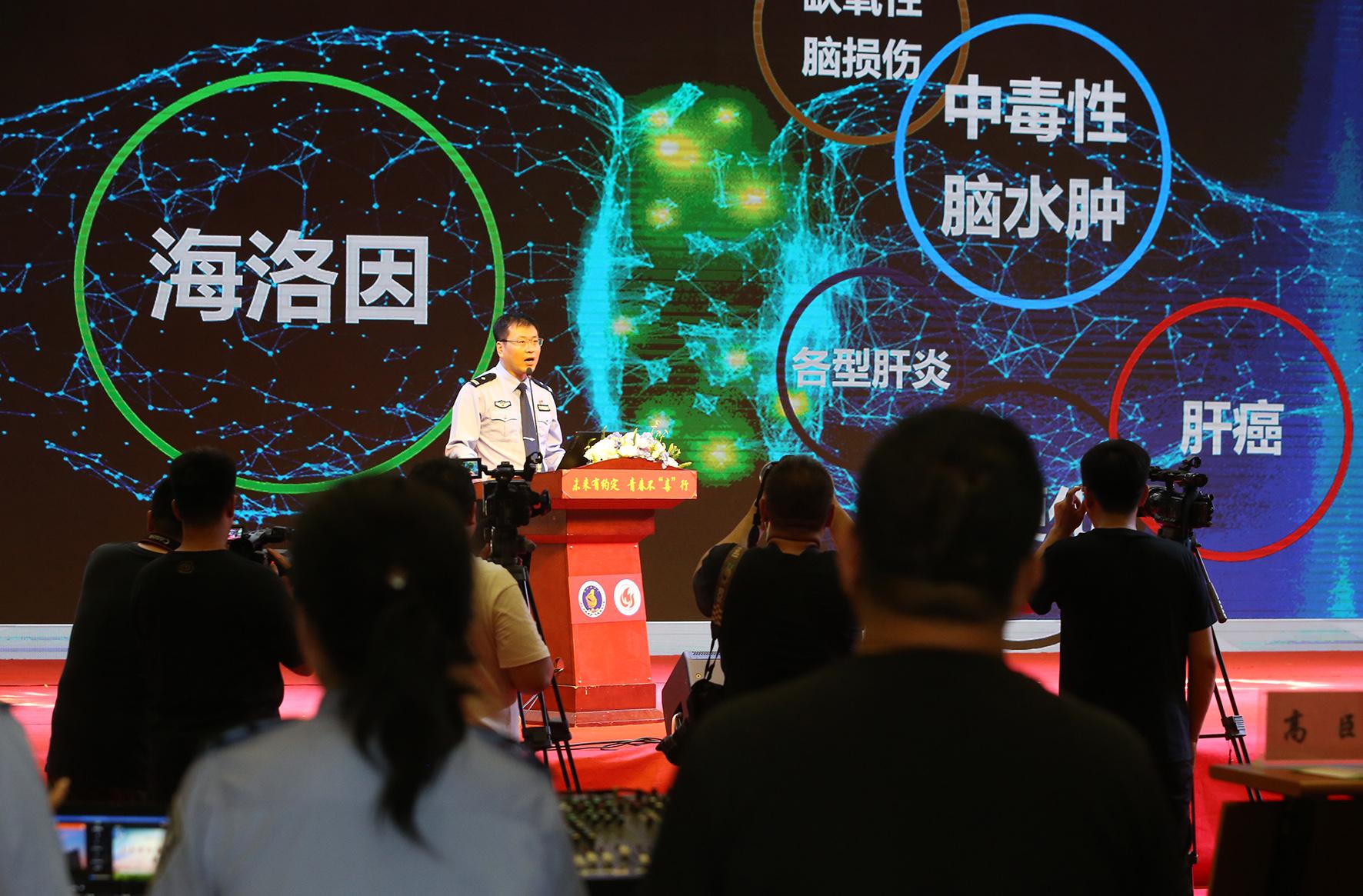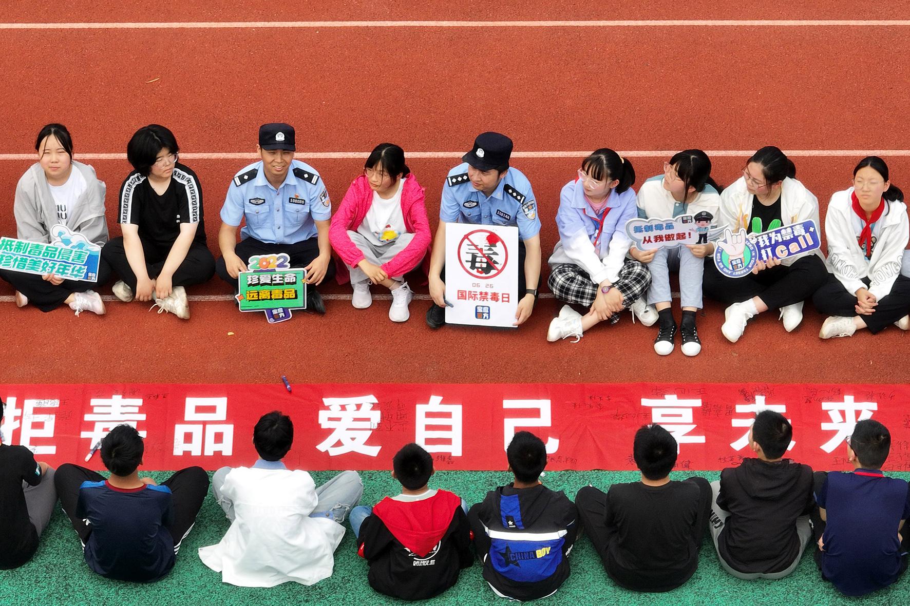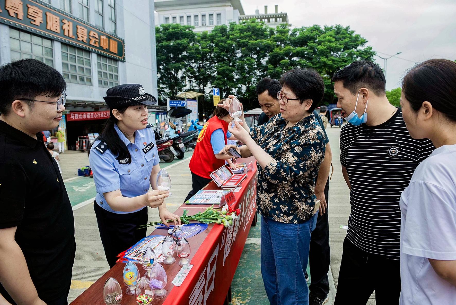 6月26日,安徽省當(dāng)涂縣公安局石橋派出所民輔警用仿真毒品樣本向?qū)W生講解毒品危害。