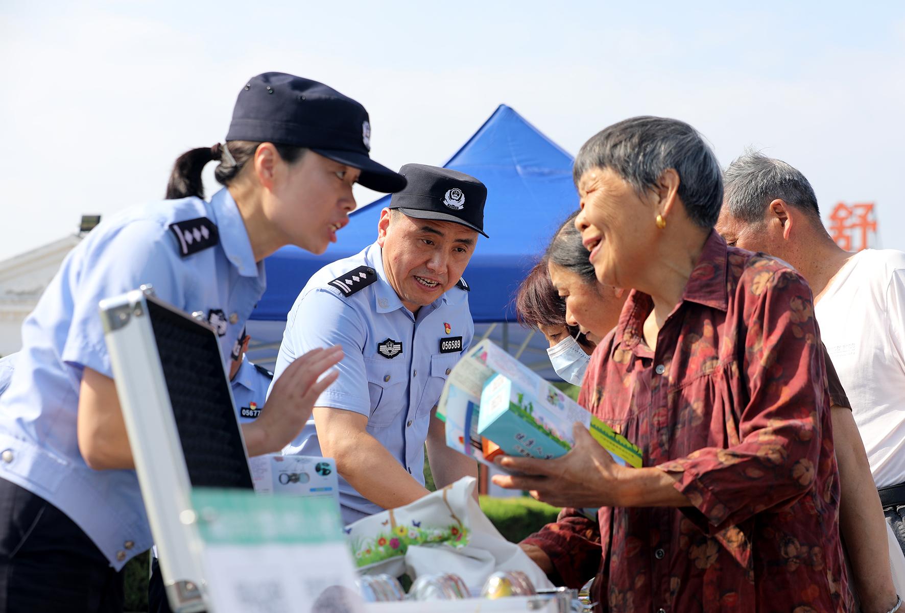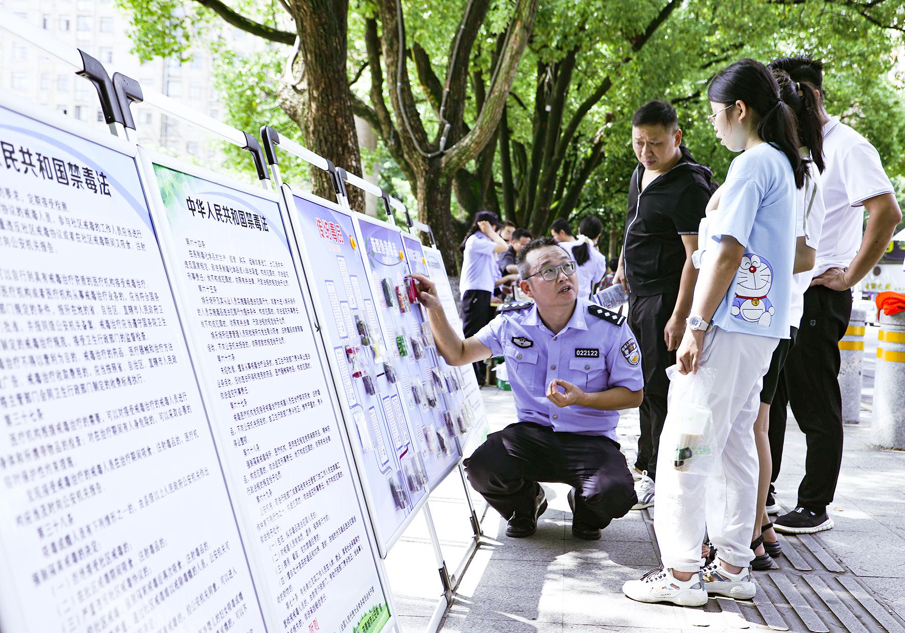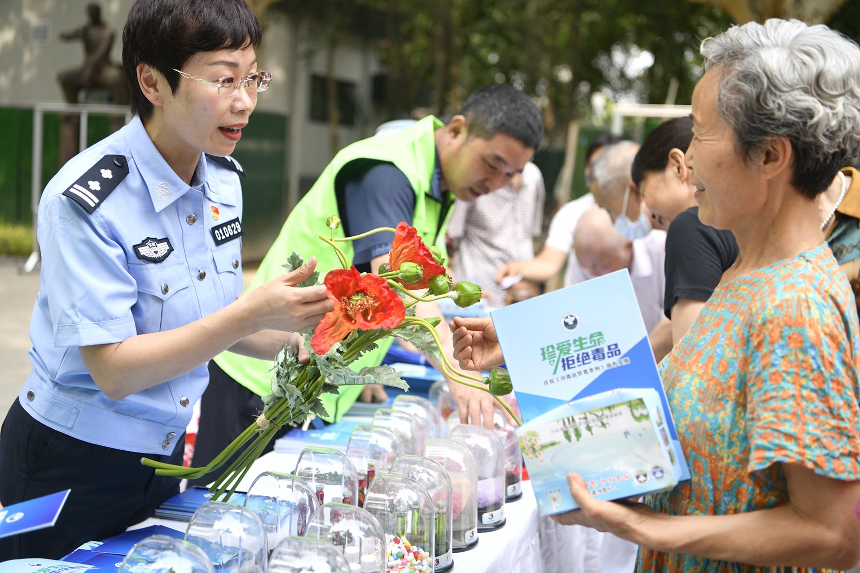 6月25日,河南省鄭州市公安局金水分局巡特警隊(duì)員與禁毒民警在文博廣場(chǎng)開(kāi)展禁毒宣傳活動(dòng)。