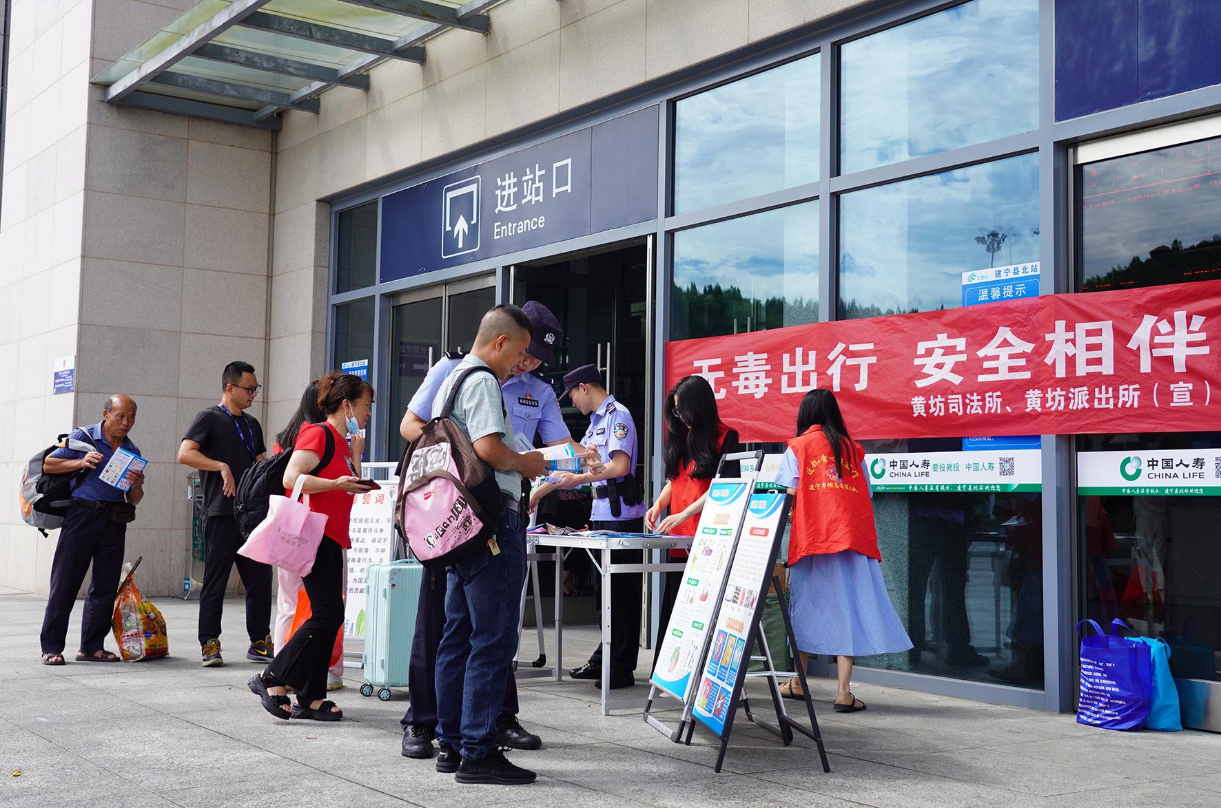 6月26日,福建省建寧縣公安局黃坊派出所聯(lián)合黃坊司法所、黃坊鄉(xiāng)政府等單位在北動(dòng)車站廣場(chǎng)開(kāi)展以“無(wú)毒出行 安全相伴”為主題的禁毒宣傳活動(dòng)。