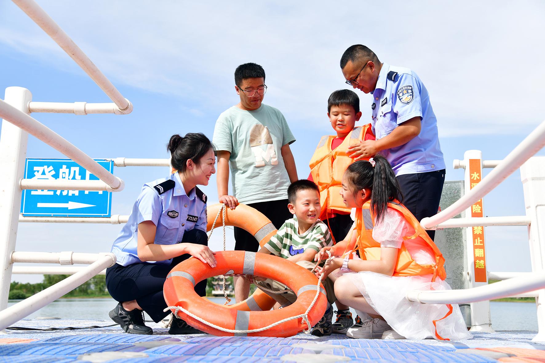 圖為7月25日,民警與志愿者向孩子們講解防溺水安全知識(shí)。