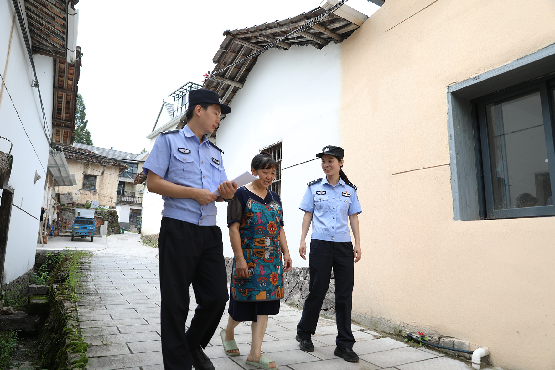 圖為8月1日,遂昌縣公安局北界新路灣派出所民警在高坪鄉(xiāng)高坪新村走訪群眾。