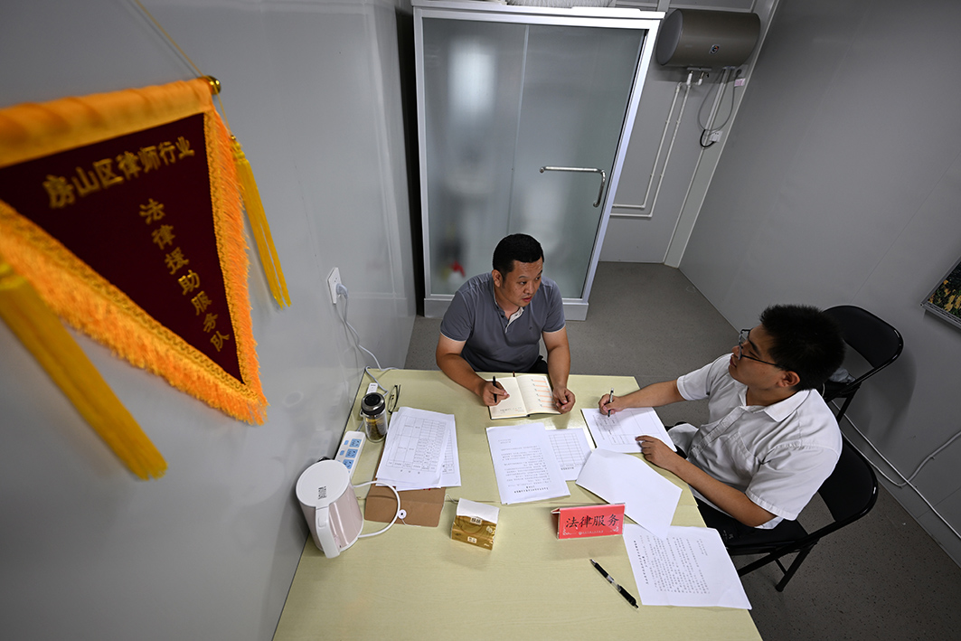 安置點(diǎn)司法工作室,房山司法局基層科科長(zhǎng)及識(shí)宇(左)與值班律師盤點(diǎn)工作重點(diǎn)。