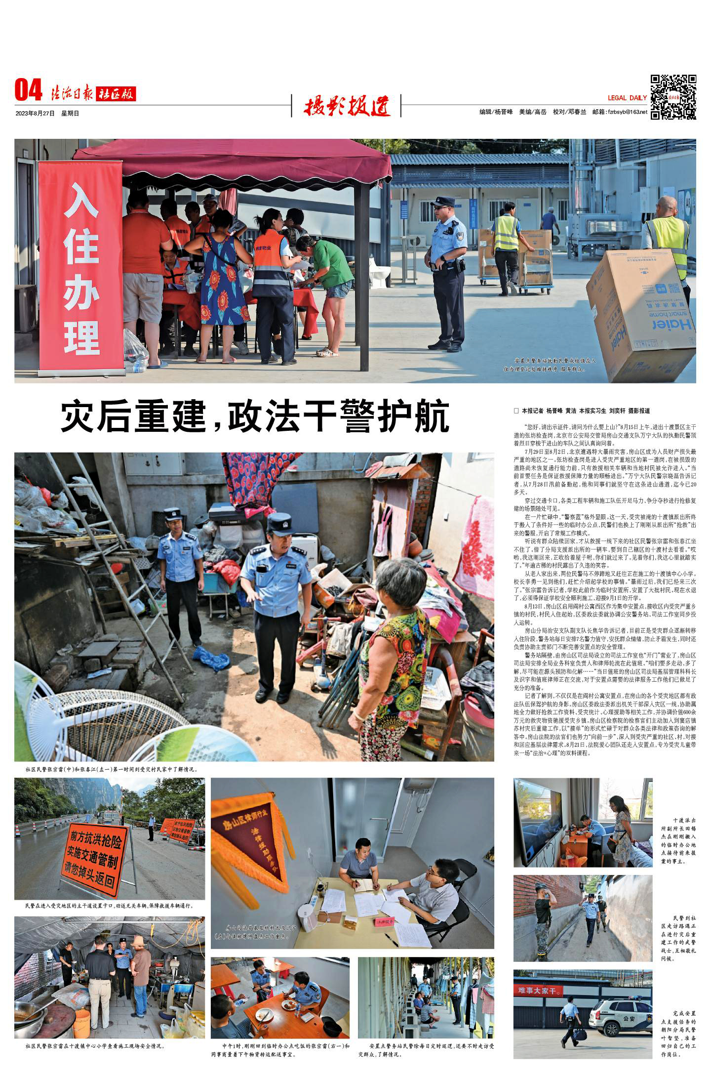 記者了解到,不僅僅是在閻村公寓安置點(diǎn),在房山的各個(gè)受災(zāi)地區(qū)都有政法隊(duì)伍保駕護(hù)航的身影。房山區(qū)委政法委派出機(jī)關(guān)干部深入災(zāi)區(qū)一線,協(xié)助屬地全力做好搶救工作資料、受災(zāi)統(tǒng)計(jì)、心理援助等相關(guān)工作,并協(xié)調(diào)價(jià)值600余萬(wàn)元的救災(zāi)物資馳援受災(zāi)鄉(xiāng)鎮(zhèn)。房山區(qū)檢察院的檢察官們主動(dòng)加入到竇店鎮(zhèn)蘇村災(zāi)后重建工作,以“接單”的形式忙碌于對(duì)群眾各類法律和政策咨詢的解答中。房山法院的法官們也努力“向前一步”,深入到受災(zāi)嚴(yán)重的社區(qū)、村,對(duì)接和回應(yīng)基層法律需求。8月21日,法院愛(ài)心團(tuán)隊(duì)還走入安置點(diǎn),專為受災(zāi)兒童帶來(lái)一場(chǎng)“法治+心理”的雙料課程。