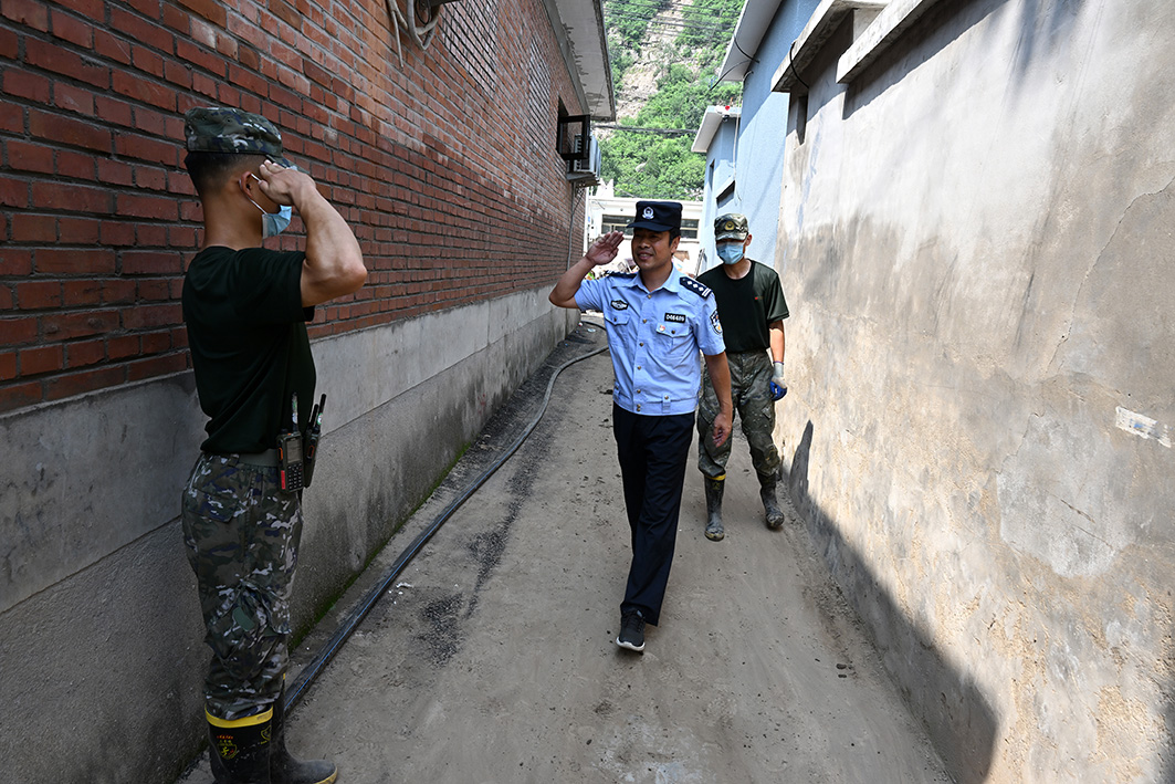 在一片忙碌中,“警察藍(lán)”格外顯眼。這一天,受災(zāi)被淹的十渡鎮(zhèn)派出所終于搬入了條件好一些的臨時(shí)辦公點(diǎn),民警們也換上了剛剛從派出所“搶救”出來(lái)的警服,開(kāi)啟了常規(guī)工作模式。