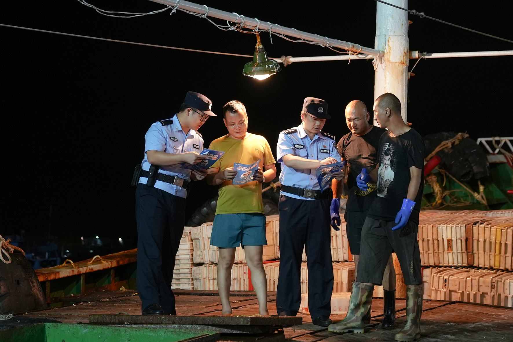 圖為9月19日晚,民警向正在船上作業(yè)的漁民開展安全防范宣傳。