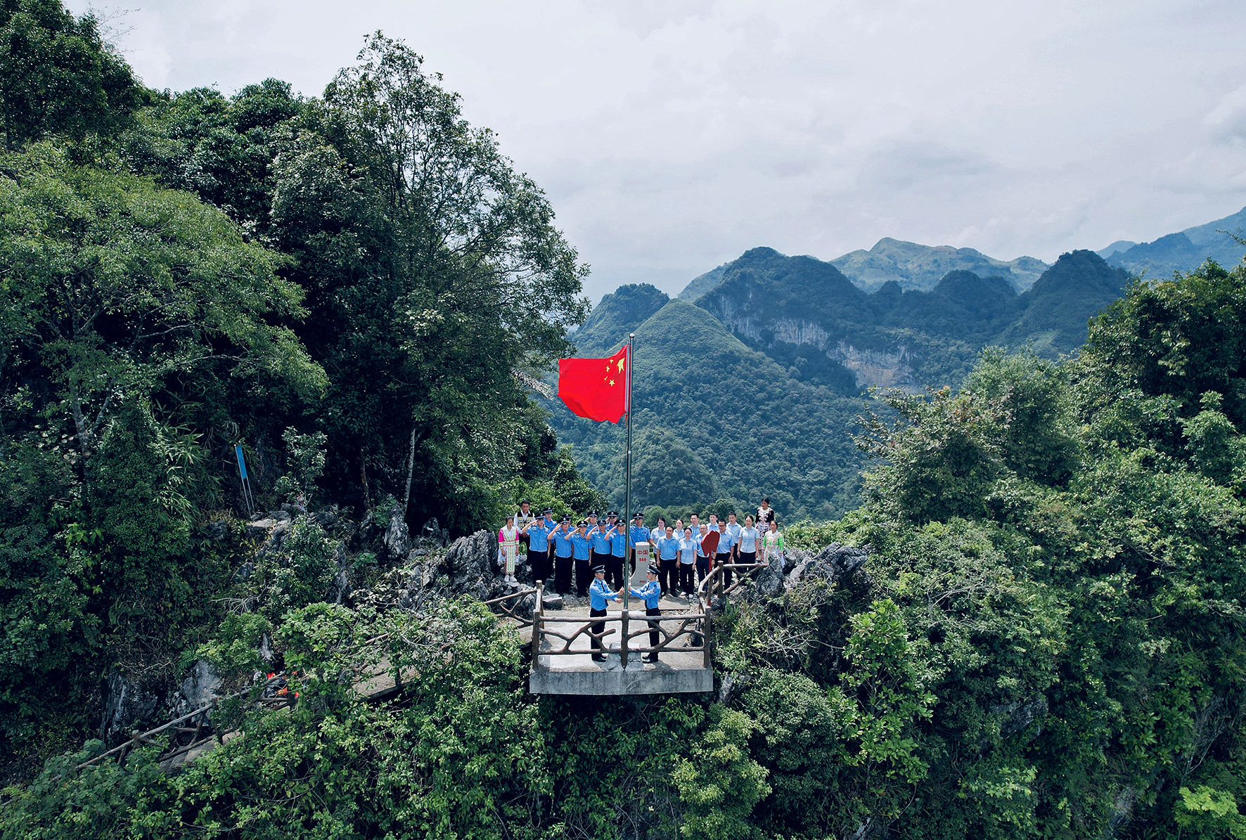 10月1日,廣西邊檢總站百色邊境管理支隊(duì)百南邊境派出所聯(lián)合駐地干部職工、少數(shù)民族群眾在祖國(guó)西南邊陲的中越588號(hào)界碑旁升起五星紅旗。