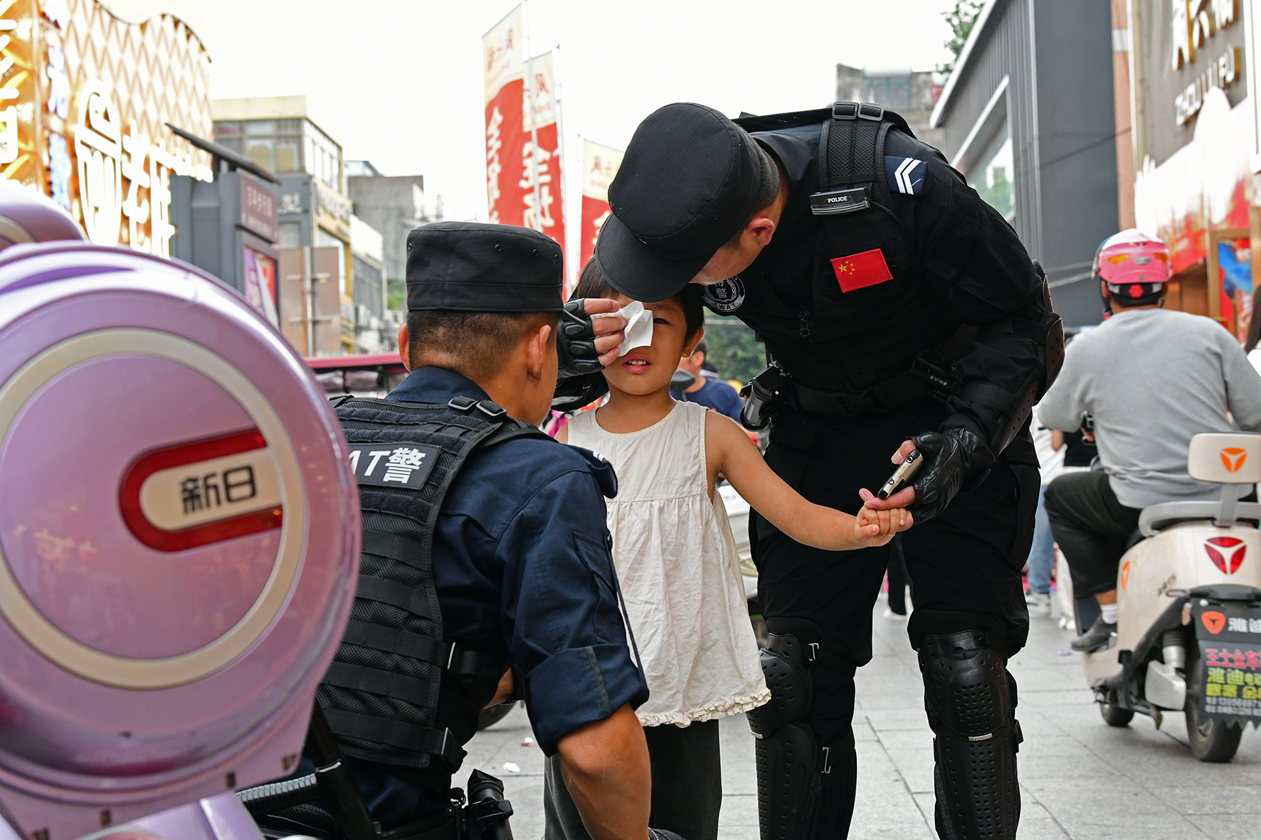 10月1日,安徽省阜南縣巡防大隊(duì)民輔警在城區(qū)萬宇商業(yè)街區(qū)巡邏時(shí)發(fā)現(xiàn)一名走失幼童。經(jīng)過半小時(shí)的尋找,終于在一地下商場(chǎng)內(nèi)通過喊話找到了幼童家人。