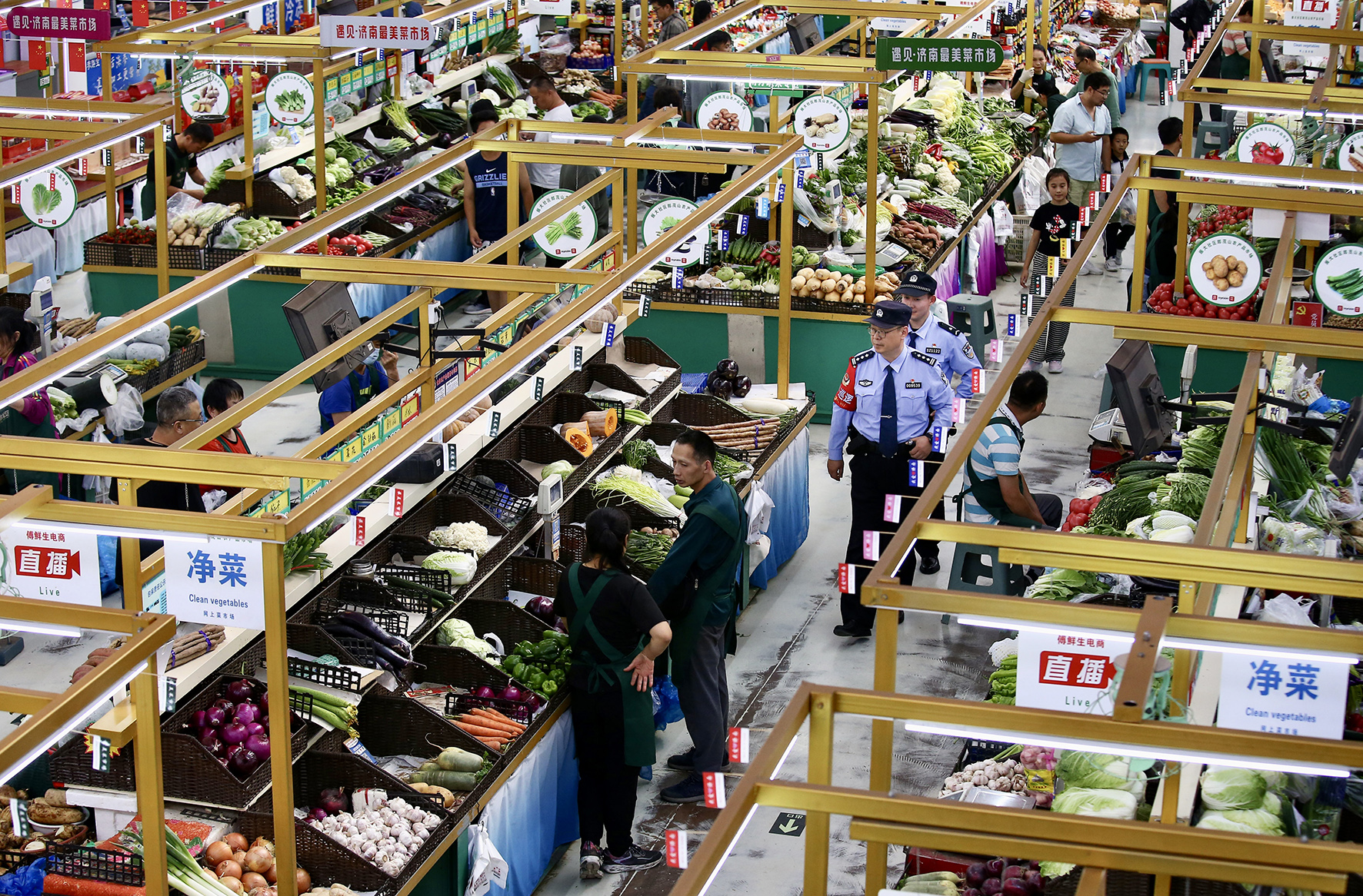 10月1日,山東省濟(jì)南市公安局市中區(qū)分局七里山派出所民警在郎茂山農(nóng)產(chǎn)品市場(chǎng)巡邏。