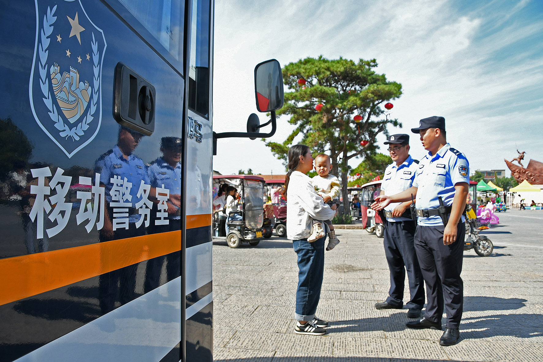 10月5日,山東省棗莊市公安局山亭分局馮卯派出所民輔警在巖馬湖畔開展巡邏防控,提醒小朋友注意安全。