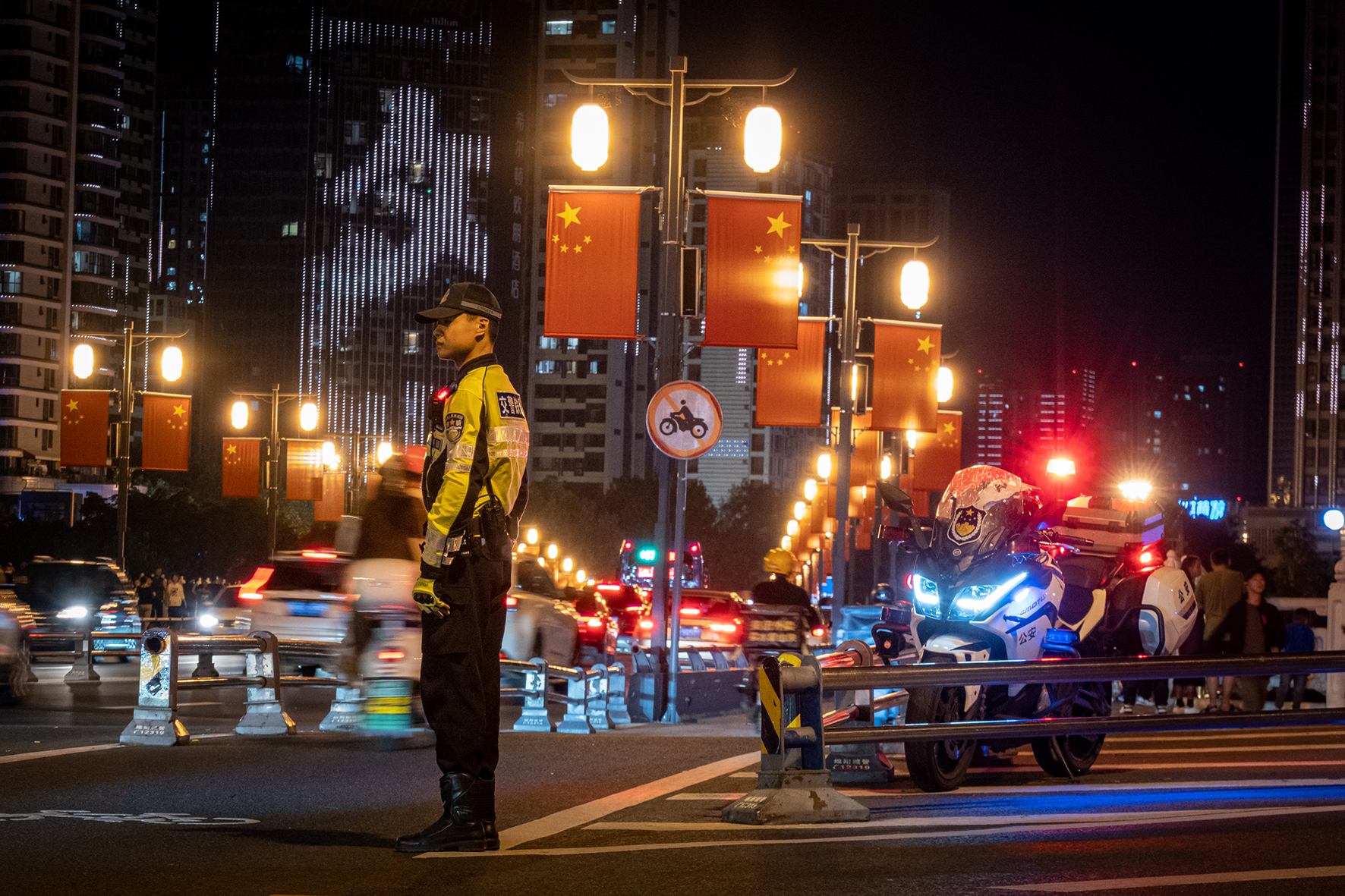 10月2日晚,四川省綿陽市公安局交警支隊(duì)執(zhí)勤民警在越王樓景區(qū)附近疏導(dǎo)交通。
