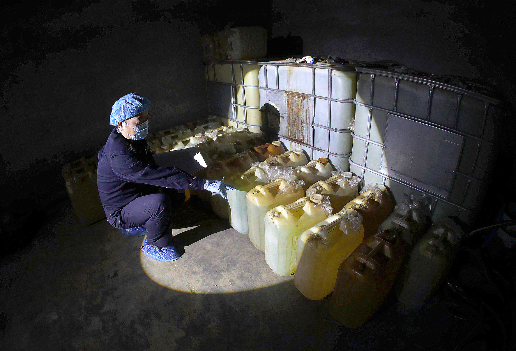 3、民警在郊外倉庫現(xiàn)場(chǎng)收繳被盜柴油。