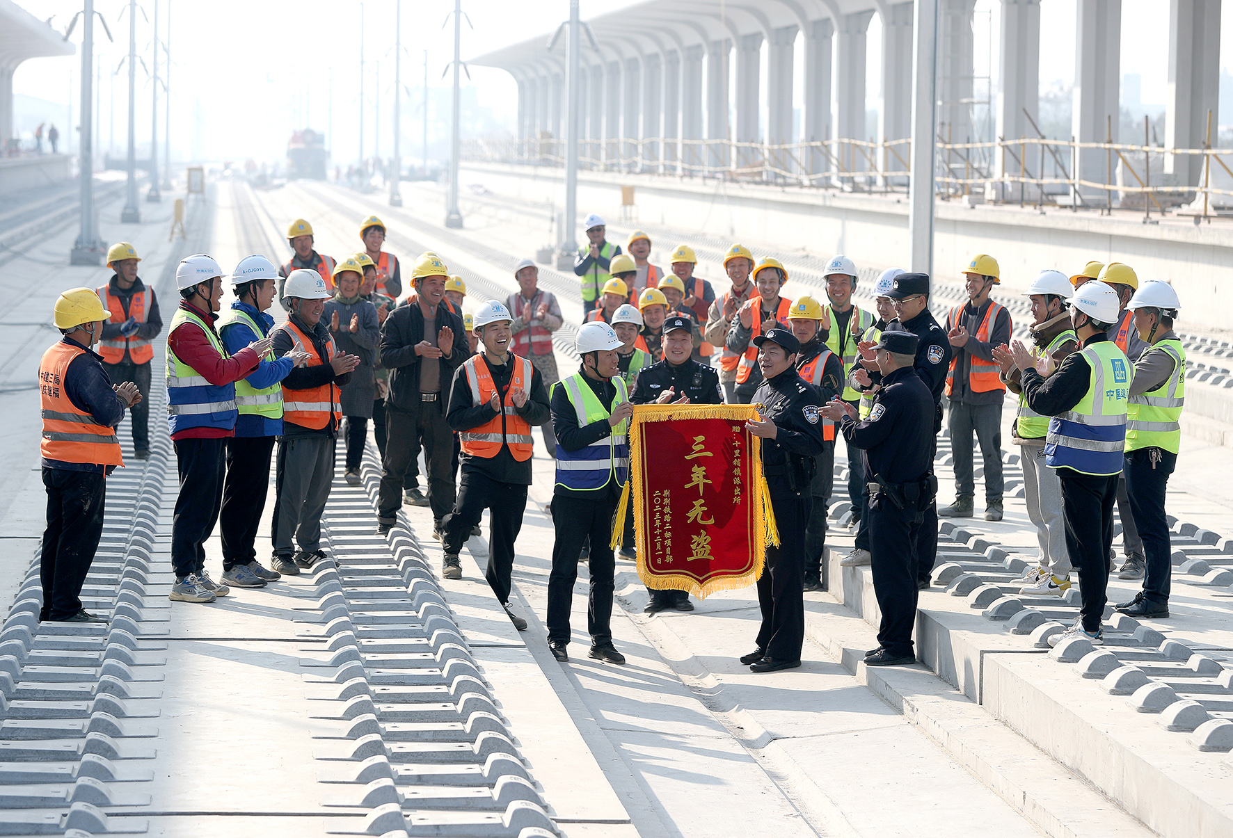 12月5日,在湖北荊荊高鐵沙洋縣十里鋪段建設(shè)工地,項目負(fù)責(zé)人率員工向湖北省沙洋縣公安局十里鋪派出所民警送上一面印有“三年無盜”的錦旗。